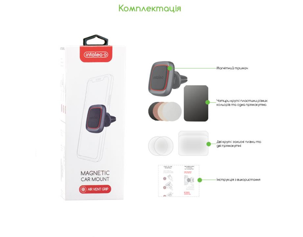 Компактний універсальний автотримач Intaleo CM01GG з вбудованим магнітом зручно й безпечно кріпиться на решітку вентиляції передній панелі авто. Пристрій міцно та надійно фіксується на тримачі CM01GG за допомогою металевої пластини, яку можна закріпити або на самому пристрої, або на його чохлі. У комплект входять металеві пластини різного кольору та форми, а також захисні плівки відповідної форми для використання разом із пластинами. Круглі пластини годяться для смартфонів і невеликих gps-навігаторів. Прямокутна, відповідно — для пристроїв із великою діагоналлю екрана (6-8"). Додаткові характеристики: Максимально універсальна сумісність: Годиться для будь-якого мобільного пристрою з плоскою задньою кришкою Забезпечує повний доступ до кнопок і роз’ємів пристрою Гнучка «ніжка» з жорсткою фіксацією обраної форми Механізм обертання на 360° У комплекті металеві пластини різного кольору та форми, а також захисні плівки відповідної форми для захисту корпусу пристрою від металу Пластини кріплять до пристрою або його чохла за допомогою адгезійного шару |