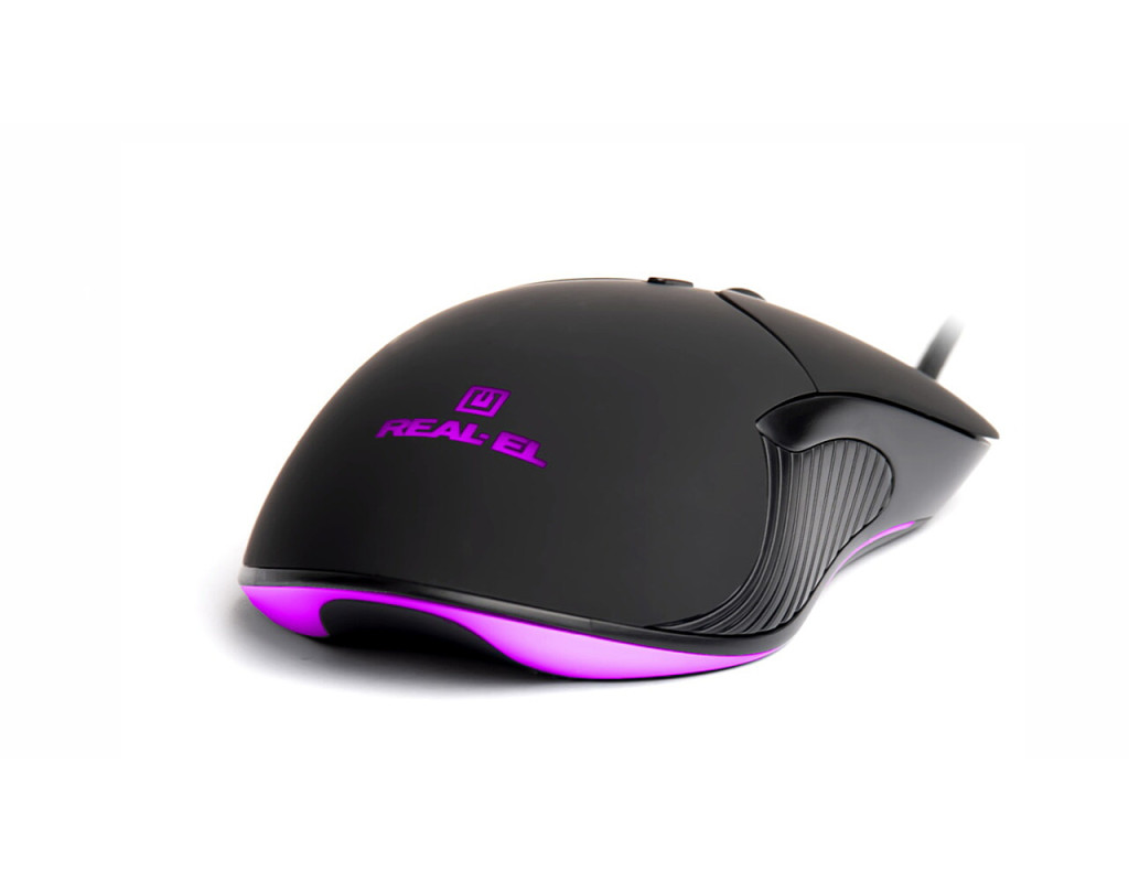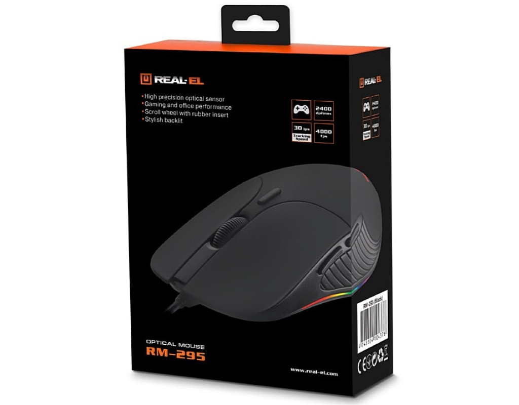 | Особливості оптичної миші REAL-EL RM-295: 5 + 1 клавіші (колесо прокручування), 2 кнопки навігації «вперед»/«назад», кнопка перемикання режимів dpi, інтерфейс USB, працює практично на будь-якій поверхні, природна форма зручна для руки. |