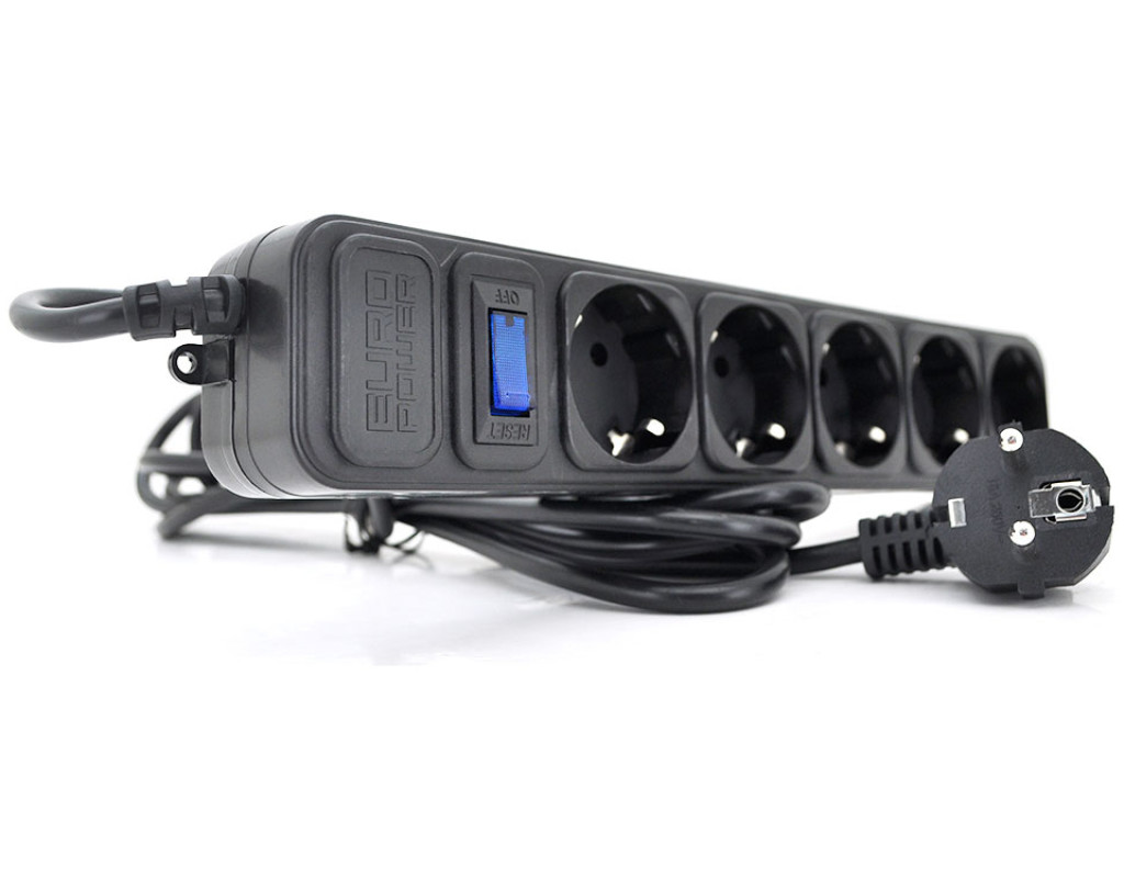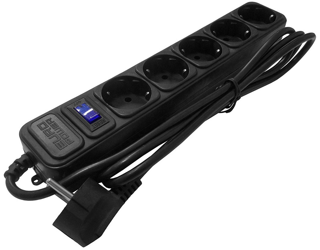 Кількість розеток - 5, євророзетка із заземленням (Тип F), Довжина кабелю - 3 м, заземлюючий контакт, із загальним вимикачем, Сумарна потужність підключеного навантаження - ≤ 2000 Вт, Колір - чорний