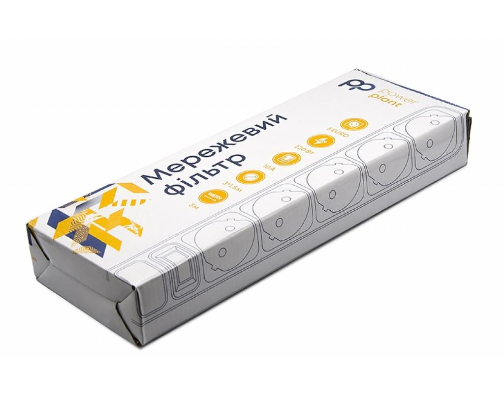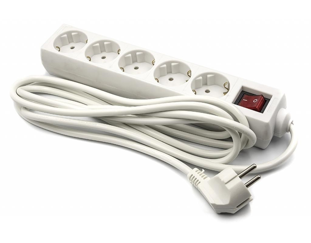 Кількість розеток - 5, Довжина кабелю - 3 м, заземлюючий контакт, із загальним вимикачем, Сумарна потужність підключеного навантаження - ≤ 1750 Вт, Колір - білий