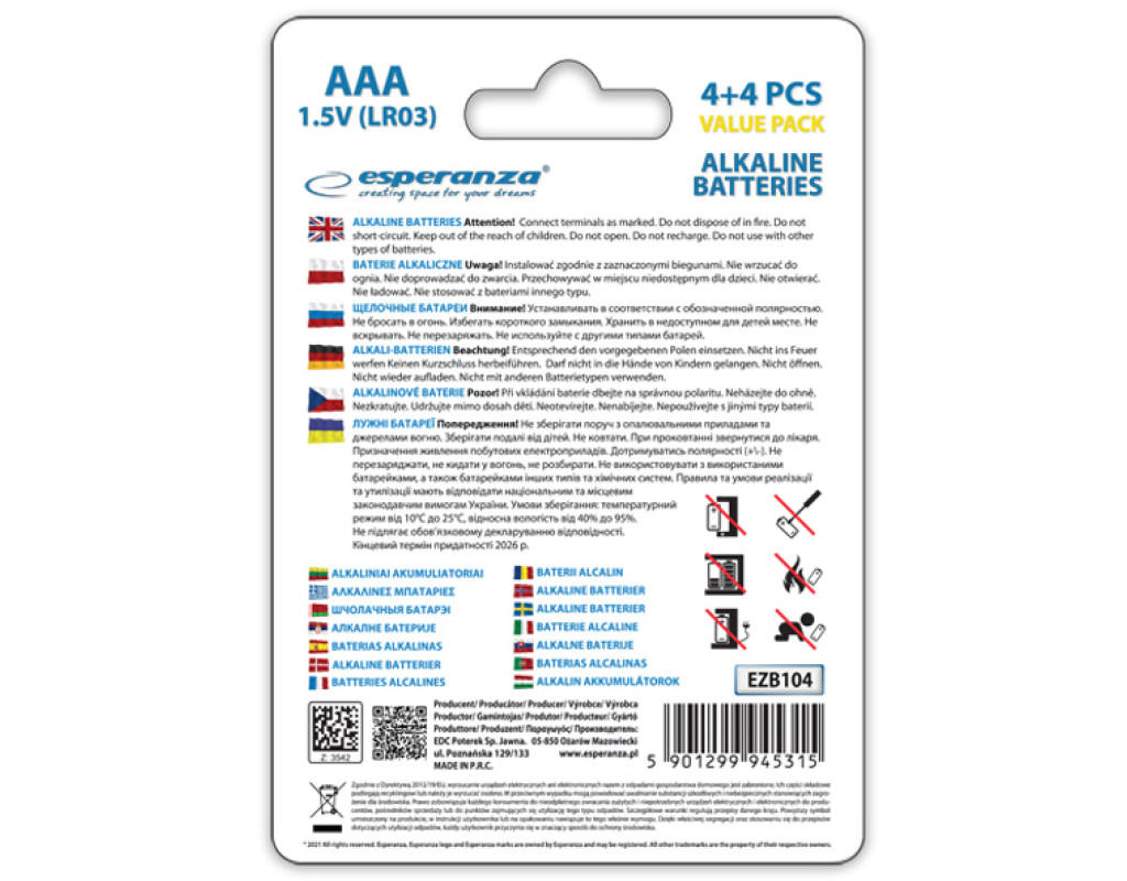 Батарейки Esperanza довго зберігаються до початку експлуатації без втрати якості. Ідеально підходять для живлення побутових пристроїв зі стандартним енергоспоживанням, як-от годинники, радіоприймачі, пульти дистанційного керування, плеєри, диктофони, електробритви, ваги, фотоапарати, компютерні миші, ліхтарі, радіостанції та ін. |