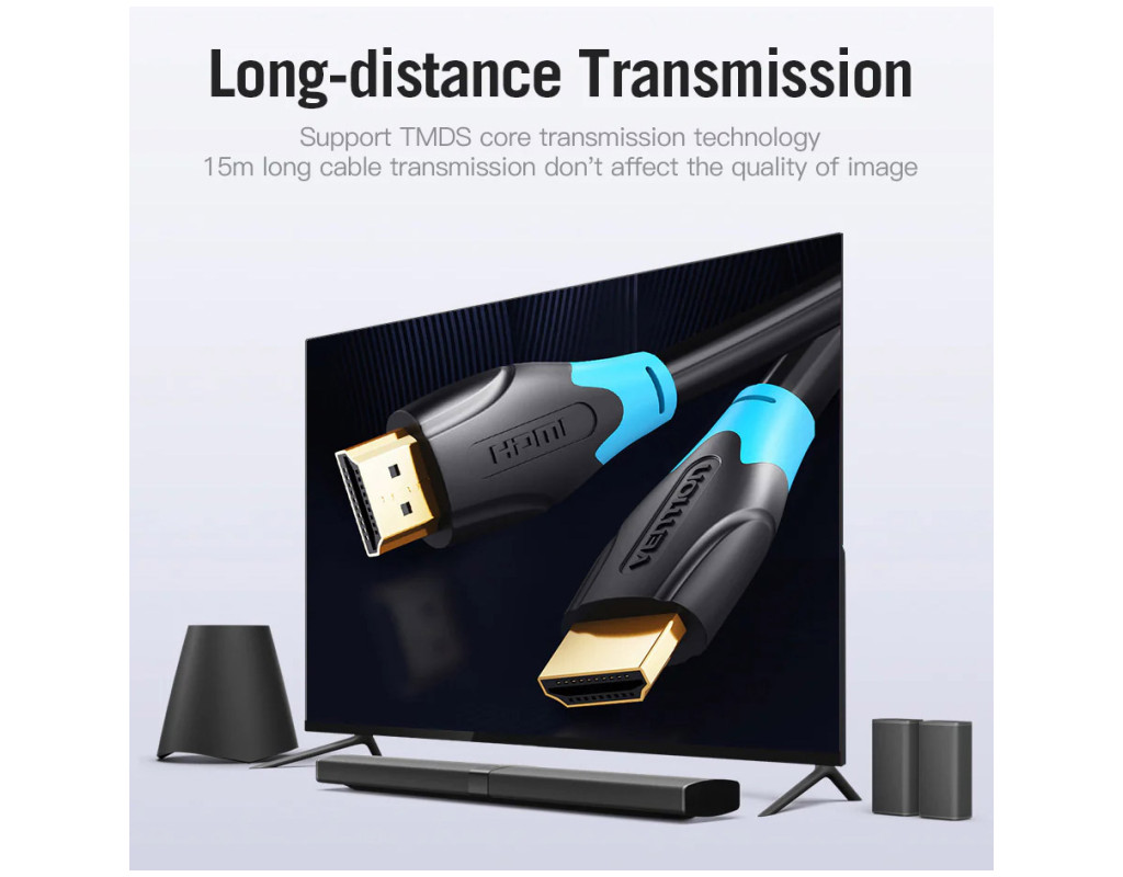 | Кабель Vention HDMI-HDMI, v2.0 with Ethernet 19M/19M – це цифровий кабель для підключення джерела відеосигналу та пристрою відображення. Канал Ethernet дозволяє кільком пристроям працювати в мережі Ethernet без необхідності підключення додаткових проводів, а також безпосередньо обмінюватися контентом, на швидкості до 100 Мбіт/сек. Кабель має пропускну здатність до 18 Гб/сек, 3D-можливості, а також підтримку більш ніж 8 аудіо каналів. Наявність зворотного каналу аудіо усуває необхідність в окремому дроті для передачі звуку в ресивер з телевізора або іншого пристрою, який є джерелом аудіо і відео. |