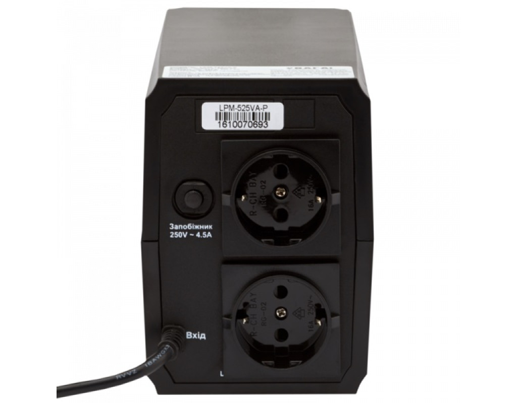 | Лінійно-інтерактивний ДБЖ/UPS LPM-525VA-P призначений для забезпечення коректної роботи побутової, офісної або промислової техніки в умовах різких перепадів напруги в мережі. Ще одна важлива функція ДБЖ/UPS LPM-525VA-P – це забезпечення короткочасної автономної роботи пристроїв при відключенні електричної енергії. Захисний функціонал інтерактивного джерела безперебійного живлення ДБЖ LPM-525VA-P (367Вт) передбачає: захист від короткого замикання, стрибків напруги, перевантаження, розряду та надмірного заряду батарей.