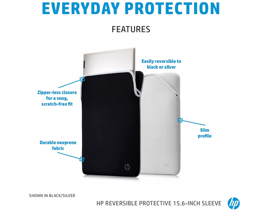 | Захисний двосторонній чохол HP для ноутбуків з діагоналлю 15,6", чорний/сріблястий. З міцного неопренового матеріалу цей чохол для ноутбука допомагає захистити ваш ПК від ударів і подряпин. Зворотний дизайн дозволяє змінювати колір, коли забажаєте. А завдяки застібці без блискавки дозволяє ноутбук безпечно та надійно фіксувати. |