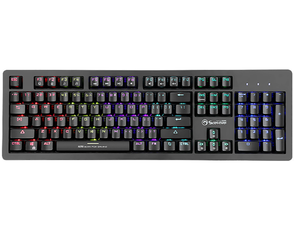 Механічна ігрова клавіатура з підсвічуванням Marvo KG916. Має компактний розмір, її зручно розмістити навіть на невеликому робочому столі. Оберіть одну з 12 схем підсвічування та насолоджуйтеся грою. Ні одне натискання на клавішу не буде втрачено, технологія Anti-ghosting, захищає від фіктивних натискань клавіш. В ігровому режимі відключається клавіша Windows, щоб її випадкове натискання не заважало грі. Механічні перемикачі (сині), спеціально розроблені з метою забезпечення збалансованого поєднання швидкості реагування і точності, а також вони мають короткий час ходу і мале зусилля спрацьовування. При цьому вони надійні і розраховані на 50 мільйонів натиснень клавіш без втрати якості. Особливості: