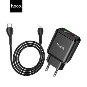 Мережевий зарядний пристрій Hoco N5 (1USB 3A QC3.0 + 1 PD Type-C) Black (S25719) + кабель Lightning