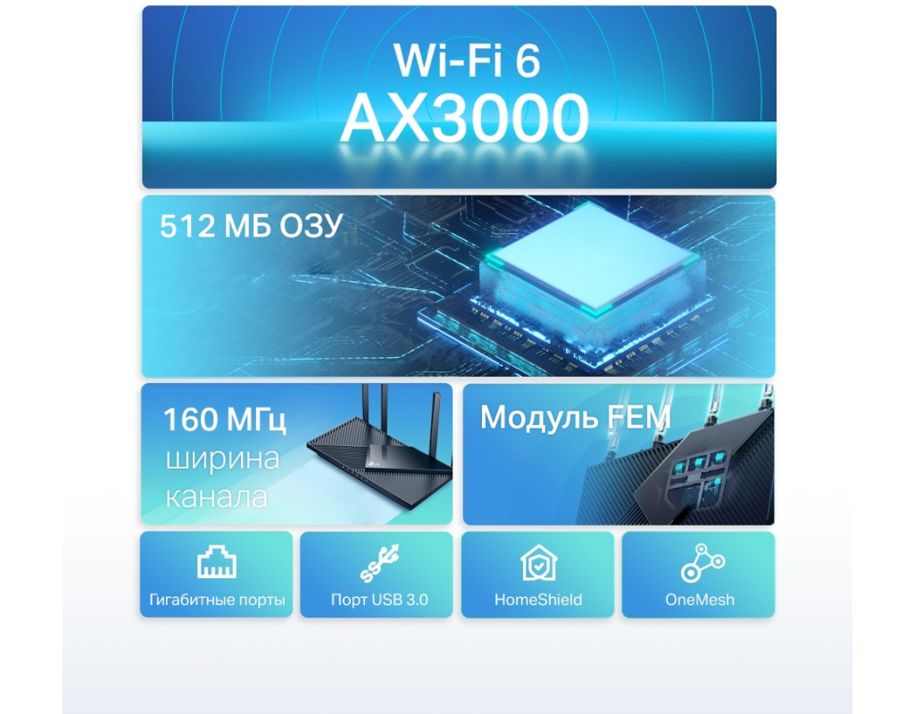 Новейшее поколение Wi-Fi — это высокая скорость, низкая задержка и увеличенное количество одновременных подключений в домашней сети. Невероятная скорость Возросшая скорость позволяет одновременно смотреть потоковые видео, скачивать файлы и играть онлайн. Нужна более высокая скорость? Тогда подключайтесь по каналу шириной 160 МГц на диапазоне 5 ГГц, чтобы смело смотреть 8K‑стримы без задержек. Быстрый отклик Меньше загрузок Наслаждайтесь плавностью одновременно запущенных онлайн‑игр и прямых траснляций. OFDMA улучшает качество Wi‑Fi подключения, позволяя нескольким клиентам использовать один диапазон одновременно, что снижает задержки и повышает качество подключения. Мощный процессор и большой объём ОЗУ Больше подключений без потери скорости Помимо Wi-Fi 6 в роутере Archer AX55 используется чипсет Qualcomm и большой объём ОЗУ, благодаря чему скорость подключения не будет падать даже при больших нагрузках. Не нагревается Верхняя панель корпуса выполнена в оригинальном современном дизайне и состоит из множества отверстий, улучшающих распределение тепла и позволяющих роутеру работать на полную мощность. Wi-Fi во всём доме Четыре мощные внешние антенны обеспечат Wi-Fi покрытие во всём доме, а технология Beamforming обнаружит подключённые устройства и будет направлять концентрированный сигнал в их направлении — особенно, если они далеко. Порт USB 3.0 Подключите внешний накопитель, чтобы без труда обмениваться файлами с подключёнными устройствами. Также накопитель можно использовать в качестве облака и подключаться к нему извне. TP-Link OneMesh: Wi‑Fi во всём доме Archer AX55 поддерживает технологию OneMesh, которая позволяет создать бесшовное покрытие и забыть про потери сигнала и задержки при перемещении. |