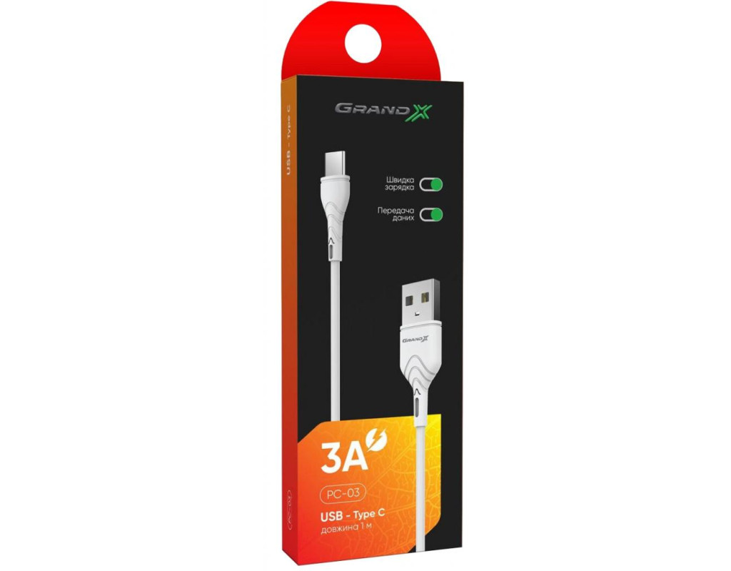 Кабель USB to Type-C, 1.0m Grand-X PC-03W (3А) white