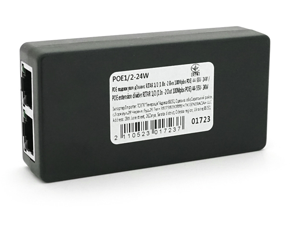 | PoE подовжувач-ділитель RITAR 1 / 2 ( 1 Вх -2 Вих 100Mpbs POE ) 24W Пристрій використовується для розгалуження з одного джерела (POE Комутатора або Інжектора) на 2 камери 1х10 / 100M вхідний порт POE + 2х10 / 100M PoE вихідний порт Пристрій живлення стандарту IEEE802.3af / at Збільшення відстані передачі до 100 метрів. Вхід: 44-55V 0.5A Вихід: 44-55V 0.25A Робоча температура ; -30 ~ + 60 ° C |