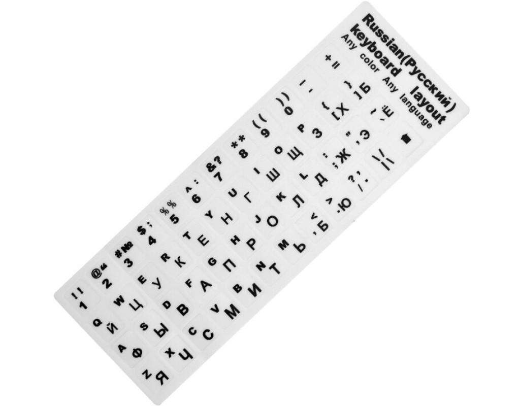 | Опис: Наклейки на білу клавіатуру з чорними літерами Рус. Англ. Характеристики: 1. Колір: білий 2. Літери: чорні 3. Мови: Російська, Англійська |