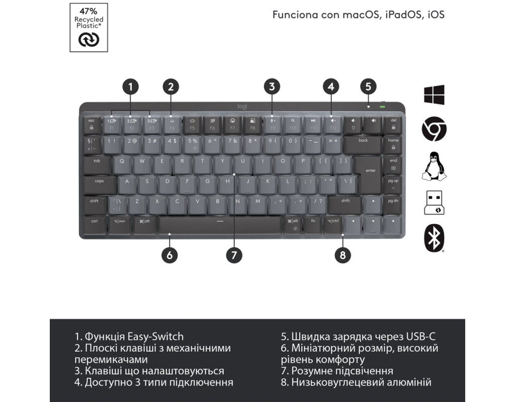 | Клавиатура Logitech MX Mechanical Mini Minimalist UA Graphite (920-010780) - это не просто аксессуар, а настоящее открытие для тех, кто ищет совершенную гармонию комфорта и технологий. Созданная для требовательных геймеров и идеальная для использования с телевизором, эта компактная клавиатура отличается лаконичным дизайном, который сочетает стиль и передовые технологии. Одним из самых значительных преимуществ является механическая конструкция с переключателями GX Brown Tactile. Они обеспечивают плавное и точное нажатие, придавая нажатиям особую плавность и четкую тактильную обратную связь, что гарантирует удовольствие от каждого нажатия. Будьте уверены, что эта клавиатура обеспечит точность и скорость ваших действий в игре или во время работы. Умная подсветка клавиш автоматически активируется при приближении рук, адаптируясь к условиям окружающего освещения, что не только добавляет удобства, но и значительно повышает энергоэффективность. Благодаря разнообразию подсветочных эффектов, вы сможете настроить окружение под собственное настроение. Клавиатура обеспечивает безупречное беспроводное соединение через USB адаптер 2.4 ГГц или Bluetooth, что позволяет легко переключаться между различными устройствами, мгновенно начиная работу. Совместимость с операционными системами Mac OS и Windows делает эту модель универсальной среди подобных аксессуаров. Эргономичный дизайн клавиатуры включает конструктивные решения, снижающие углеродный след. Корпус изготовлен из переработанного пластика, что вместе с использованием возобновляемых источников энергии при производстве алюминия подчеркивает экологические обязательства бренда. Заряжать клавиатуру просто - всего 15 минут через USB-C и вы обеспечены зарядом на целый день. Интеллектуальное энергопотребление автоматически регулирует подсветку для максимального сохранения заряда, даже при низком уровне батареи. Выбирая Logitech MX Mechanical Mini, вы выбираете качество, уникальные функции и ответственность перед окружающей средой. Это сочетание надежности, стиля и инноваций преобразит ваши повседневные задачи в впечатляющий опыт. |