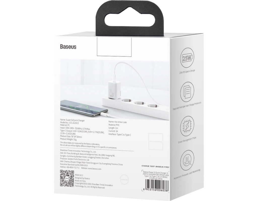 Зарядное устройство Baseus 1xUSB 25W (USB-C) + Cable Type-C white (TZCCSUP-L02)