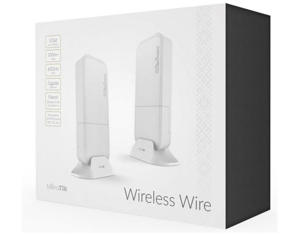 Точка доступа Wi-Fi Mikrotik RBwAPG-60ad kit представляет из себя комплект из беспроводных точек MikroTik в количестве 2 штуки для гигабитных радиомостов, что выполнены в корпусе компактной структуры MikroTik wAP. Оборудование предназначено для частот 58320 – 64800 МГц с применением одного из новейших стандартов беспроводной связи 802.11ad. Точки доступа из комплекта Wireless Wire имеют 4-ех ядерные процессоры IPQ-4019 (частота 716 МГц). Присутствует и необходимый для подключения Ethernet-порт на 1 Гбит с поддержкой пассивного питания при помощи PoE стандарта Passive PoE / 802.3af/at (PoE+) 12 - 57 В. Управление и контроль происходит под управлением RouterOS Level 3. Wireless Wire 60G оснащен высокопроизводительным процессором Qualcomm IPQ-4019, в котором каждое ядро выполняет функции с частотой в 716 МГц. Задача wAP 60G состоит в обеспечении высокоскоростного соединения на расстояниях вплоть до 200 м. Максимальная скорость гарантируется только на расстояниях в пределах 100 м. Так как имеет место большое затухание сигнала, то производитель MikroTik рекомендует применять RBwAPG-60ad kit на расстоянии до 100 м. В полнодуплексном режиме владелец сможет получить максимальную скоростью в 1 Гбит. Используя wAP 60G kit Вы сможете получить по 950 Мбит одновременно на отправку и прием. |