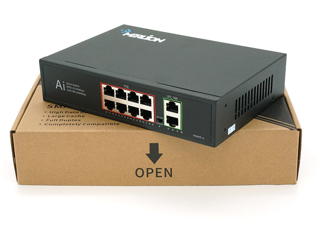 | POE комутатор Merlion 8 POE 10 / 100 + 2 RJ45 10 / 100 / 1000 + вбудований блок живлення 52V 2.3A |