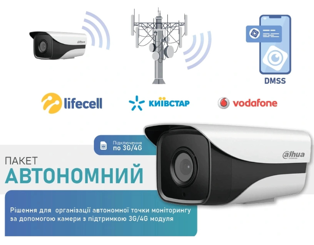 Кит-комплект – это заранее подготовленное и проверенное решение. Автономный кит-комплект на базе оборудования Dahua – это решение, которое поможет закрыть потребность в эффективном видеонаблюдении с помощью видеокамеры DH-IPC-HFW4230MP-4G-AS-I2 с 4G подключением и поддержкой операторов связи Lifecell, Киевстар и Vodafone. В варианте "минимум" этот комплект будет состоять из камеры и настенного кронштейна. Главная особенность этого решения – это использование сети сотовой связи 4G – для размещения системы видеонаблюдения в местах, где невозможно получить подключение к интернету с помощью кабеля или расположенной неподалеку wi-fi точки. Также вы можете быстро получить доступ к видео с помощью мобильного приложения DMSS через P2P технологию. Дальность ИК подсветки камеры составляет 80 метров. В любом варианте комплект прекрасно подойдет как для временных, так и для постоянных задач. Объекты гражданской инфраструктуры, частные дома, ЖК, бизнес-объекты, а также использование в качестве тактического инструмента разведки. |