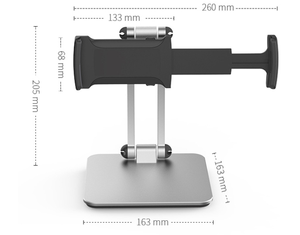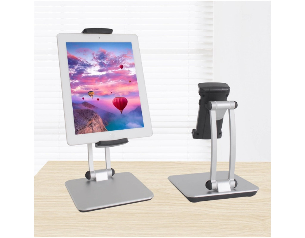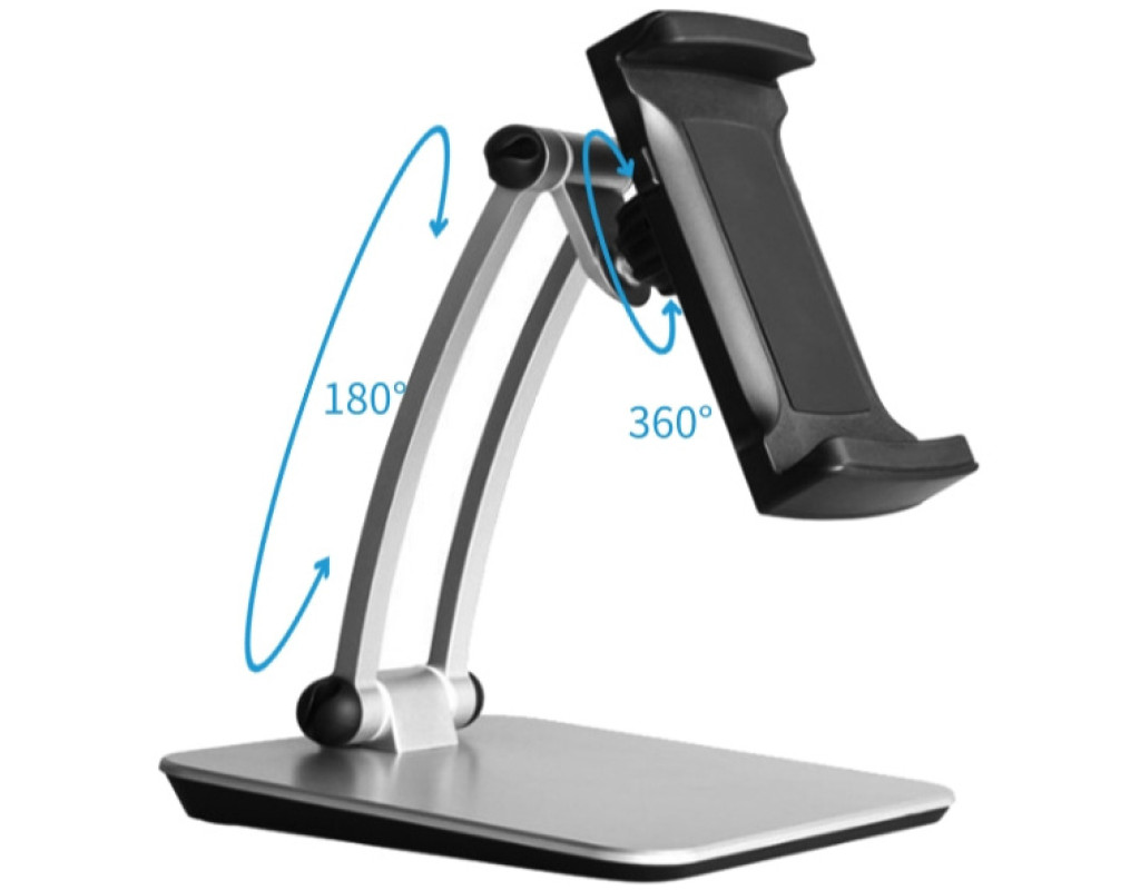 "Универсальный гибкий настольный держатель для планшета с поворотом на 360°, легко настраиваемый на самый удобный угол обзора, который облегчит вам жизнь. Главное преимущество - это просмотр без помощи рук. Этот держатель для планшета отлично подходит и для телефона, освобождает руки от усталости. Держатель очень гибкий, имеет эргономичный дизайн, и вы можете согнуть ее в любую форму. Материал: алюминий (рука) + пластик (кронштейн) + пластик (базовая поверхность). Портативный и легкий: легко перемещается и разбирается, вы можете использовать свое устройство где угодно. Универсальная посадка: эта подставка имеет поворотный зажим, который может стабильно удерживать планшеты и телефоны в пределах от 4 до 13,5 дюймов (длина растяжки 120-200-260 мм). Стабильная металлическая основа: правильный вес металлической основы устойчиво поддерживает подставку, предотвращает ее падение." |