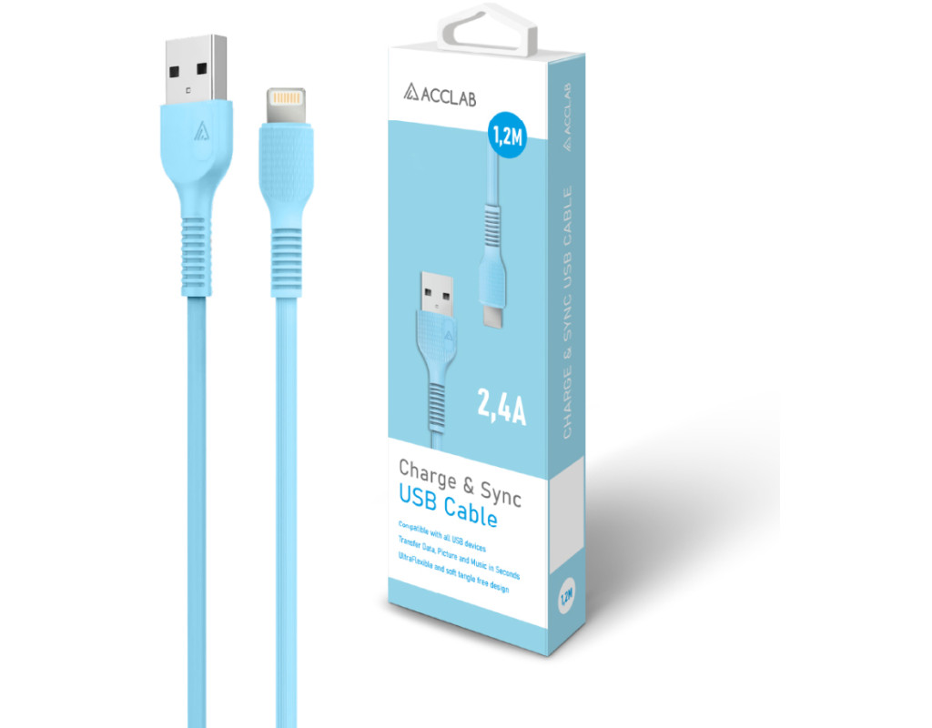 | Кабель синхронизации ACCLAB USB to Lightning удобной длинны 1.2 м незаменимая вещь для зарядки телефонов и планшетов. Изготовлен из пластичного экологичного материала TPE. Коннектор специальной гибкой формы. Поддерживает быструю зарядку 2.4А |