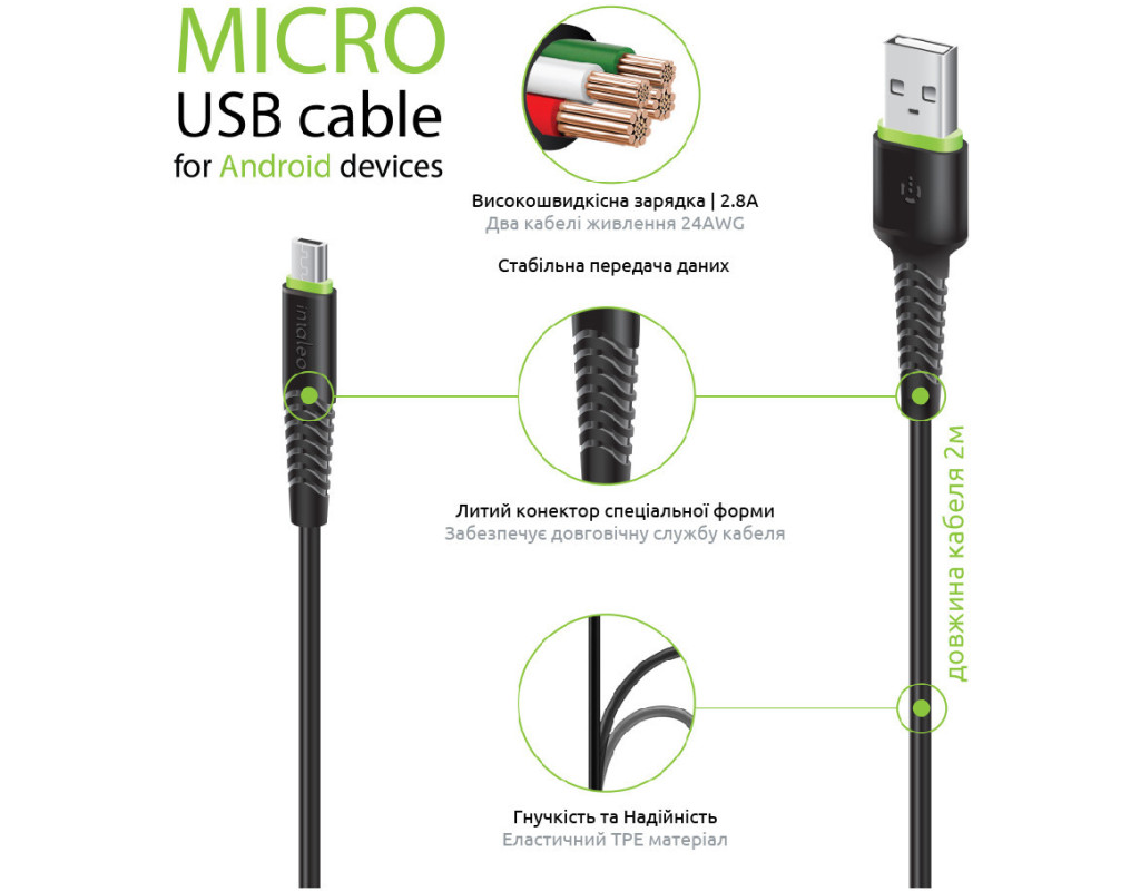 | Кабель синхронизации Intaleo Micro USB – качественный и незаменимый аксессуар для владельцев мобильных устройств, оборудованных Micro USB разъемом. Литый коннектор специальной формы и эластичный TPE-материал обеспечивают долголетнюю эксплуатацию кабеля, а его пропускная способность тока (до 2.8 А) позволяет заряжать устройство максимально быстро. Отличительной особенностью этой модели от подобных кабелей Intaleo является его длина: 2 м. Она подойдет пользователям, которые экономят свободное место на рабочем столе и хотят избежать запутывания кабеля. Особенности: