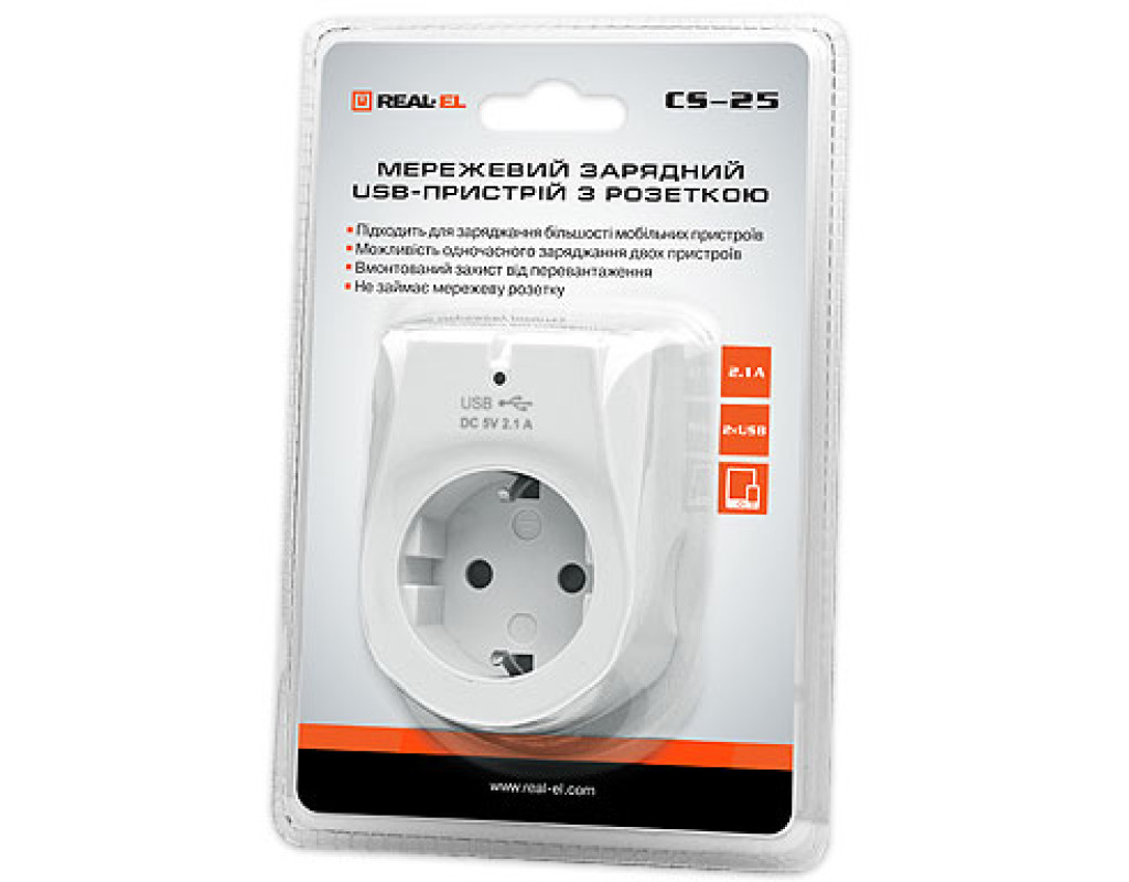| Сетевое зарядное USB-устройство с розеткой CS-25 предназначено для подзарядки аккумуляторов или питания портативных устройств от бытовой электросети и одновременного использования его как силовой розетки. |