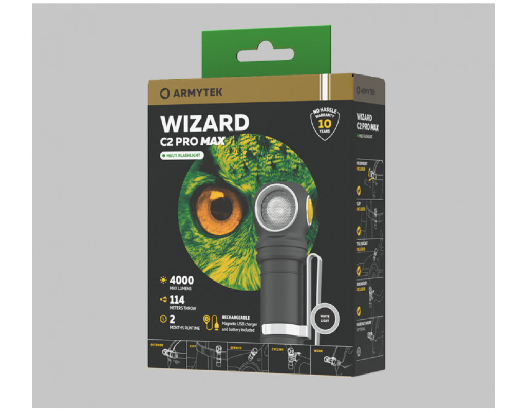 Семь режимов работы с соответственно 4000, 1300, 450, 150, 45, 7 и 0,6 люменами. Если есть необходимость, то можно перейти на профессиональный режим эксплуатации фонаря. Он предполагает использование десяти режимов. Главные особенности модели: широкий угол освещения в пределах 110-150 градусов и плавный переход между дальнобойным пучком света и боковой засветкой. Такой луч в состоянии хорошо освещать и ближнюю дистанцию, и также отдельные предметы на значительном отдалении. Фонарь отличается универсальностью, и годится как для использования во время промышленных работ, так и для туризма. Конструкция здесь такова, что можно применять фонарь вместе с аккумуляторами двух типов: 21700 или 18650 с разрядным током 1,5 A. Зарядка происходит при помощи магнитного зарядного устройства USB. Для полного заряда необходимо 5 часов 20 минут. Модель эффективно защищена от короткого замыкания, тем самым гарантирована безопасность при работе даже в случае прикосновения к магнитному разъему металлических предметов. Оптическая система представлена конусной TIR линзой, которая обеспечивает круглое световое пятно. Светодиод Cree XHP70.2 вместе с электроникой Pro Max даёт мощное и яркое свечение вне зависимости от уровня заряда батареи и температурных условий. Фиксировать модель можно по-разному: посредством крепления на голову либо каску, мощного магнита в задней части корпуса, металлического зажима и велосипедного крепления ABM-01. Если применять фонарь вместе с налобным креплением, то угол светового луча поддаётся регулировке на 180°. Также можете его снять с крепления и задействовать в качестве ручного фонаря. Корпус изготовили из анодированного алюминия с защитой по стандарту IP68 — фонарь работает во время погружения под воду на большую глубину. Высокая ударопрочность: сохранность и целостность фонаря гарантированы даже при падении с высоты 10 метров. Защищён от перегрева, опция срабатывает по умолчанию, когда температура корпуса достигает 58°C. Управление происходит через нажатие одной кнопки. Характеристики: