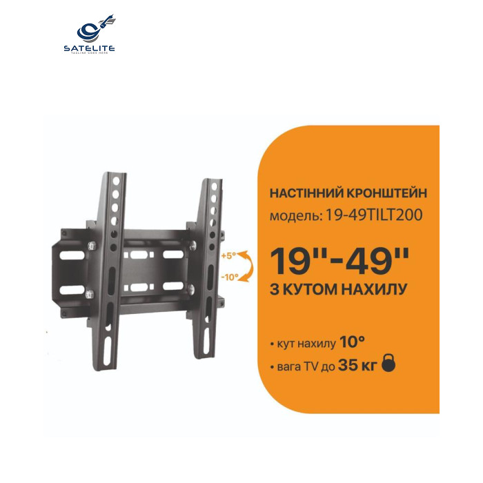 | Кронштейн SATELIT 19-49TILT200 обеспечивает комфортный просмотр любимых телеканалов благодаря своей наклонной конструкции. После надежного закрепления ТВ на стене, остается возможность изменить угол наклона до 10° по вертикали.