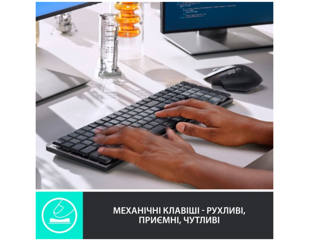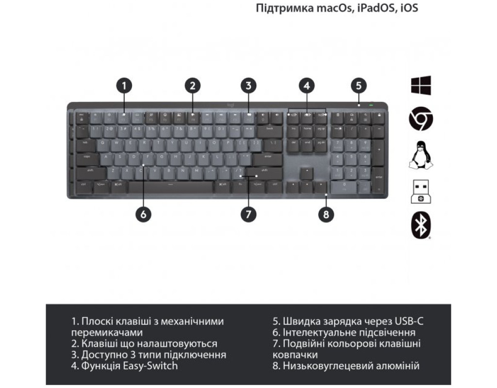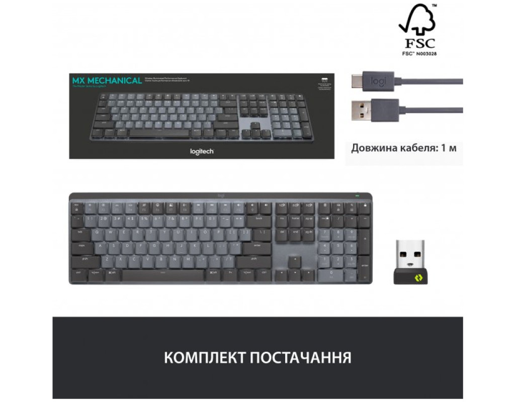 | Клавиатура Logitech MX Mechanical Wireless Illuminated Performance UA Graphite (920-010759) является идеальным выбором для тех, кто ценит качество, производительность и экологичность в одном устройстве. Полноразмерный дизайн оснащен двумя видами раскладки - украинской и английской, что делает её универсальным инструментом для любого пользователя. Механическая конструкция клавиатуры обеспечивает плавный и комфортный ввод текста благодаря GL Clicky переключателям. Эти щелкающие переключатели гарантируют высокую тактильную отдачу и четкость нажатия, что способствует быстрой ориентации на клавиатуре. Несмотря на плоский дизайн, ваши пальцы легко скользят по матовой поверхности клавиш, обеспечивая комфорт даже во время длительных сеансов печати. Одним из ключевых преимуществ является умная подсветка с автоматической регулировкой. Белая светодиодная подсветка реагирует на приближение ваших рук и автоматически подстраивается под условия освещения, что способствует сохранению заряда батареи. Это действительно умный подход к энергосбережению, который повышает эффективность использования устройства. Клавиатура поддерживает беспроводное подключение через Bluetooth или USB адаптер 2.4 ГГц, что обеспечивает стабильную связь с вашим ПК или Mac. Благодаря быстрой зарядке через USB-C, клавиатура может работать до 15 дней на одной зарядке, или до 10 месяцев с выключенной подсветкой. Это устройство станет вашим надежным партнером в работе, обеспечивая гибкость и удобство использования. Особое внимание уделено материалам: металлическая основа и переработанный пластик подчеркивают соблюдение принципов устойчивости. Даже алюминий корпуса изготовлен с использованием энергии из возобновляемых источников, уменьшая углеродный след этого продукта. И наконец, Logitech MX Mechanical получила СЕРТИФИКАТ CARBON NEUTRAL, что гарантирует экологичность всех процессов - от производства до конечного использования. Вы можете быть уверены, что выбирая эту клавиатуру, вы вносите вклад в сохранение нашей планеты. Наслаждайтесь сочетанием инноваций и ответственности с Logitech MX Mechanical. |