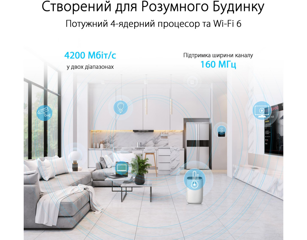 | Двухдиапазонный маршрутизатор класса AX4200: стандарт Wi-Fi 6 (802.11ax), поддержка технологии AiMesh, система информационной защиты AiProtection Pro, функции Safe Browsing, Instant Guard и VPN, средства родительского контроля, легкая настройка, настенное крепление. Wi-Fi для умного дома - маршрутизатор стандарта Wi-Fi 6 на базе 4-ядерного процессора, который поддерживает большое количество одновременно подключенных устройств и обеспечивает скорость обмена данными до 4200 Мбит/с. Эстетичный и практичный дизайн - инновационная подставка для настольного и настенного крепления и ультраминималистичный дизайн, благодаря которому устройство впишется в любой интерьер.