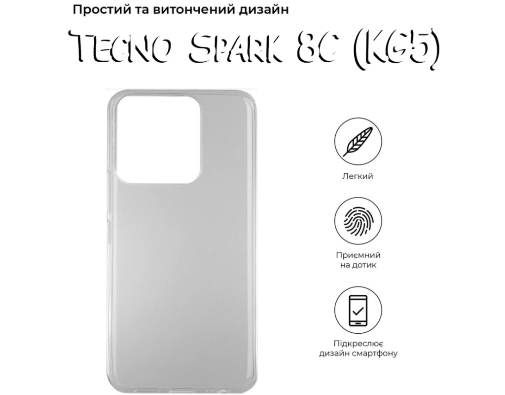 совместимость с моделями - Tecno Spark 8C, Тип чехла для телефона - накладка, Назначение - модельный, Материал - силикон, Цвет - прозрачный