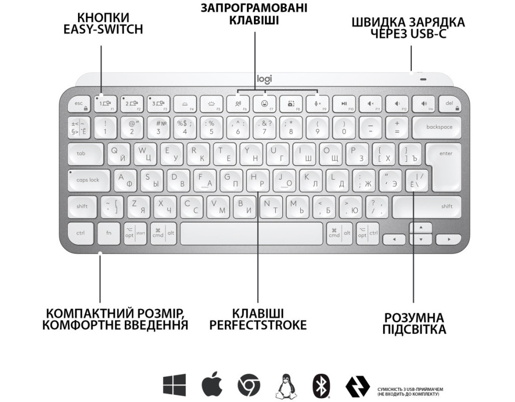 | Знакомьтесь с новым словом в области мультимедийных решений — клавиатура Logitech MX Keys Mini Wireless Illuminated UA Pale Grey (920-010499). Созданная специально для тех, кто ценит минимализм и удобство, эта клавиатура станет вашим незаменимым помощником во время работы с телевизором или компьютером. Ее компактный форм-фактор позволяет легко находить место даже в небольших помещениях. Эта клавиатура представляет собой сочетание совершенного дизайна и интеллектуальных функций. Благодаря мембранной конструкции, клавиатура обеспечивает невероятную плавность и естественность нажатий. Клавиши Perfect Stroke выполнены таким образом, чтобы соответствовать форме кончиков ваших пальцев, обеспечивая максимальный комфорт во время длительной работы. Закругленные края клавиш и матовое покрытие позволяют пальцам скользить с невероятной легкостью, а ощутимая обратная связь гарантирует точность каждого нажатия. Благодаря подсветке клавиш, ваш рабочий процесс останется эффективным даже в темных условиях. Это идеальное решение для ночных творцов и профессионалов, работающих в любое время. Синхронизируйте клавиатуру через Bluetooth или USB адаптер 2.4 ГГц с различными устройствами, такими как Windows или Mac OS, и наслаждайтесь беспроводным подключением, которое не ограничивает свободу ваших движений. Не забудьте об уникальных возможностях этого устройства, в частности регулировке громкости, что позволяет легко и быстро управлять звуковыми настройками без лишних усилий. Клавиатура Украинской и Английской раскладки удовлетворит потребности любого пользователя, позволяя без препятствий пользоваться как локализованными, так и общеупотребительными символами. Корпус MX Keys Mini выполнен из прочной металлической пластины, что придаёт ей надёжности и стабильности на любой поверхности. Почувствуйте новый уровень комфорта и продуктивности с Logitech MX Keys Mini — выбор, который соответствует вашим высоким стандартам. |