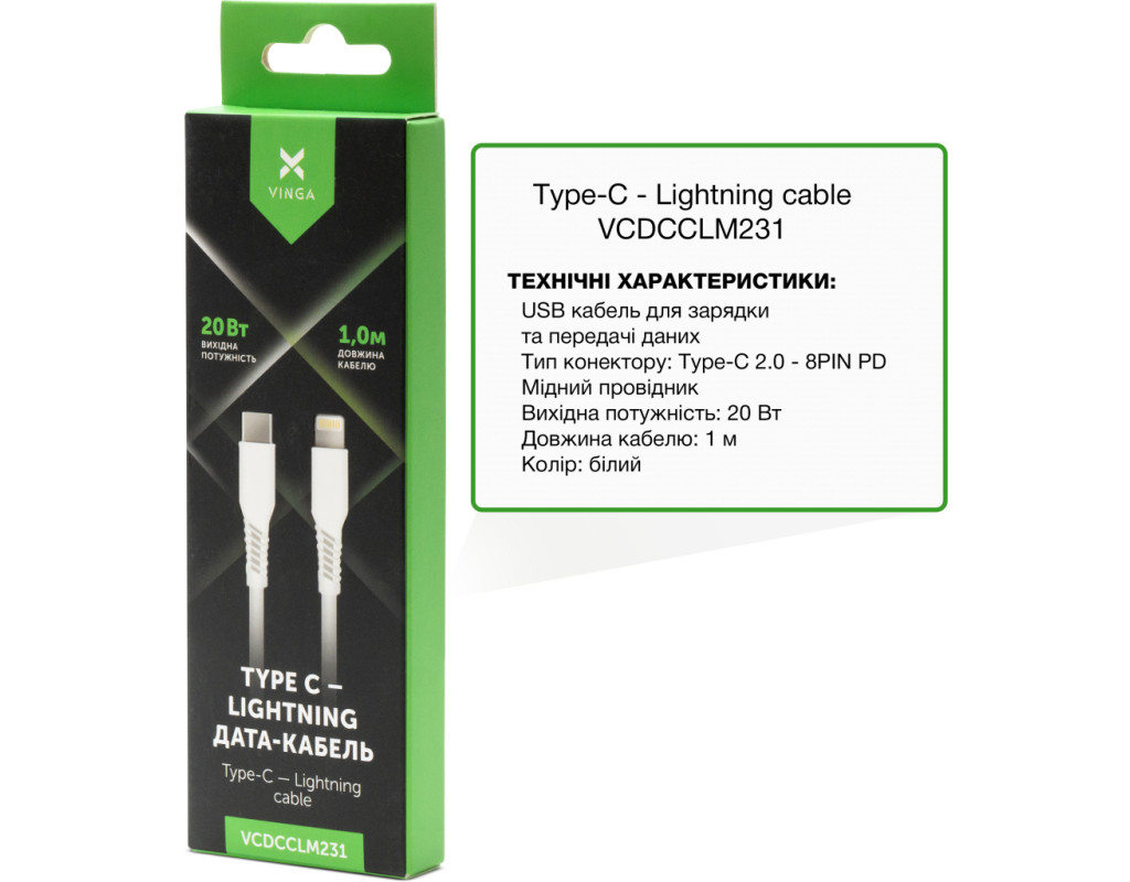 Дата кабель USB-C to Lightning 1.0m 3A 20W TPE Vinga (VCDCCLM231)