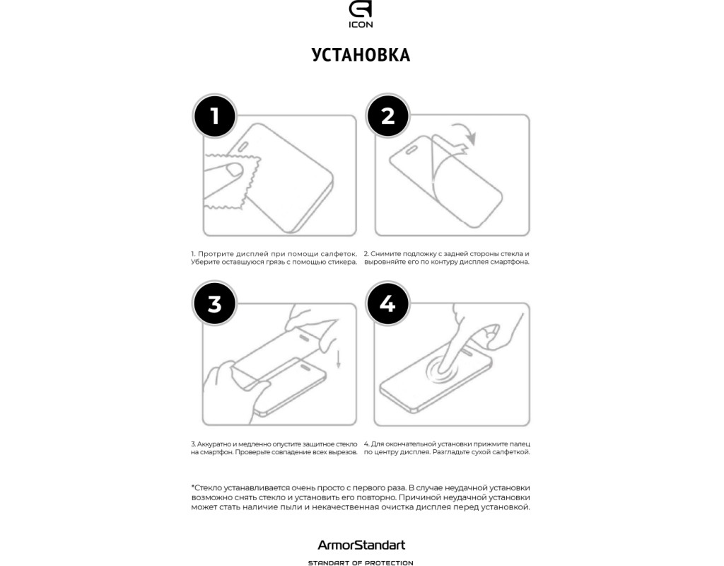 Защитное стекло Armorstandart Icon Series - это новый, невероятный уровень в защите дисплеев смартфонов. В производстве используется инновационное закаленное стекло, которое проходит специальную обработку в течении нескольких часов, для достижения максимальной прочности и гладкости поверхности. Благодаря этому удалось достичь идеальную прозрачность защитного покрытия без искажений изображения, а также наилучшую защиту от трещин и царапин. При установке данного защитного стекла отзывчивость дисплея никак не изменится. В нем содержится специальный материал, препятствующий появлению сколов. Верхняя часть стекла содержит финально доработанное олеофобное и гидрофобное покрытие. При использовании стекла это обеспечивает максимально природные тактильные ощущения — пальцы легко скользят по поверхности. Изображение отображается с высокой четкостью и природной яркостью. Задняя часть по всей площади покрыта клеевой обширным клеевым слоем наилучшего качества. Удалось достичь полное отсутствие пузырей при первичной установке. Защитное стекло Armorstandart Icon Series имеет аутентичные габариты и толщину в 0.3 мм. Предусмотрены вырезы под все датчики, камеры и разъемы. В комплект входит все необходимое для быстрой и комфортной установки. Особенности: