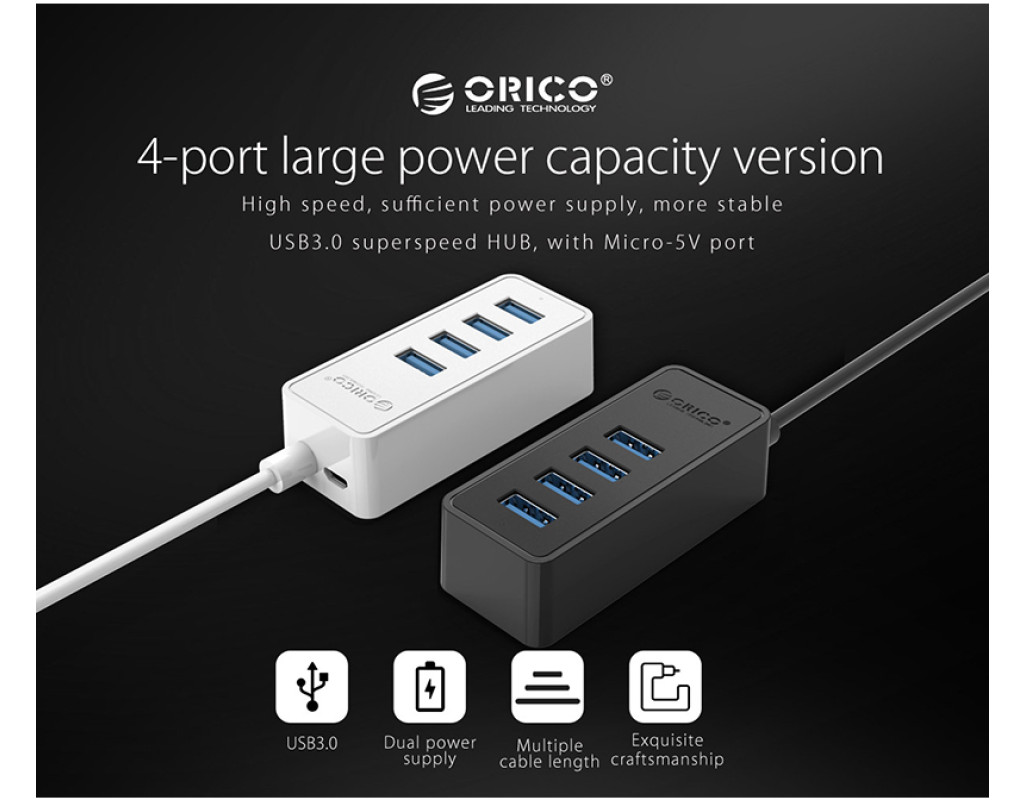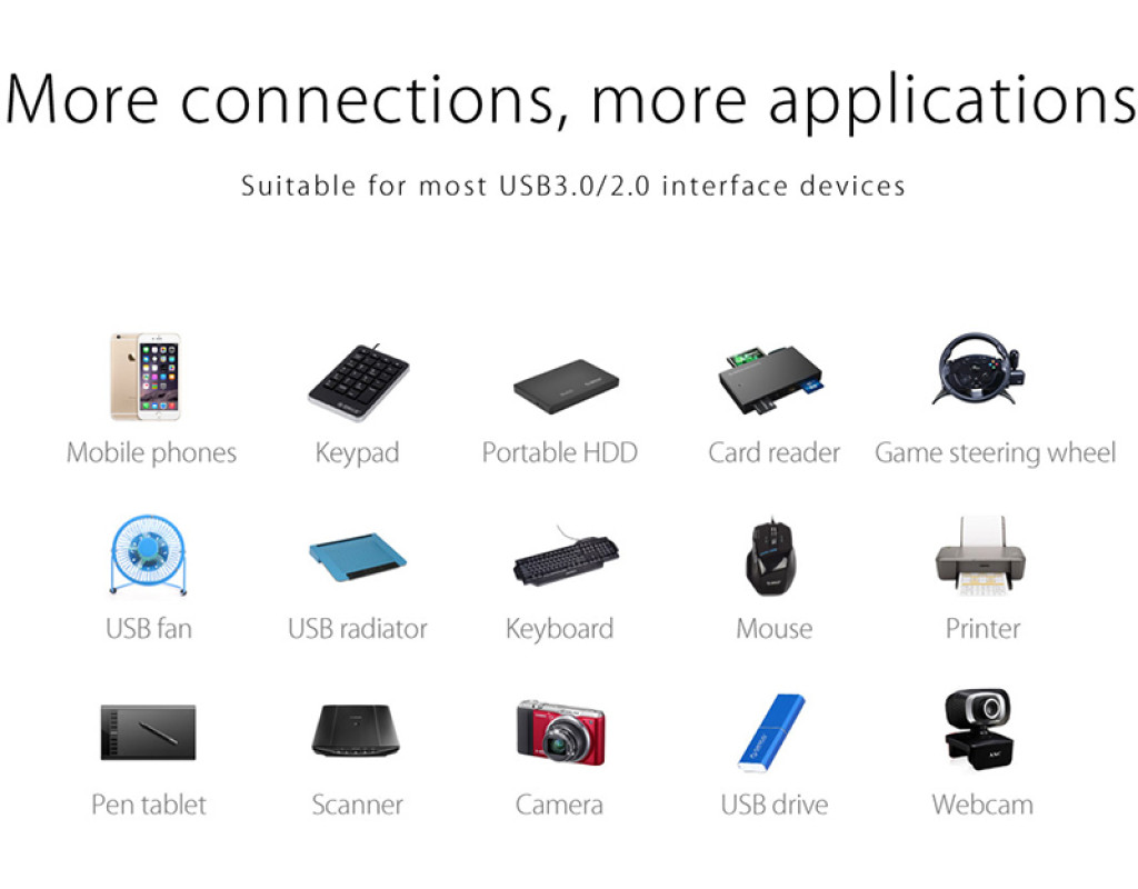 ORICO USB W5P-U3-100-BK-PRO совместимы с внешним жестким диском, флэш-накопителем, мобильным телефоном, планшетом, кардридером, медиаплеером, мышью, клавиатурой, камерой, принтером, сканером и большинством USB-устройств. Скорость передачи данных USB3.0 достигает 5 Гбит/с. Также его можно использовать в качестве концентратора для зарядного устройства USB.
