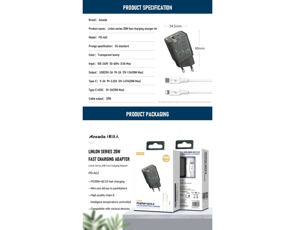 | Cетевое зарядное устройство Xinrui A62 Fast Cherge 20W идеально подходит для путешествий, дома или офиса - его карманный размер позволяет брать этот компактный, легкий, прочный адаптер в любое место. Сочетание высокой прочности корпуса делает его ударопрочным, теплостойким и более долговечным. В комплекте идет надежный кабель с разъемом Type-C/Lightning. Характеристики: