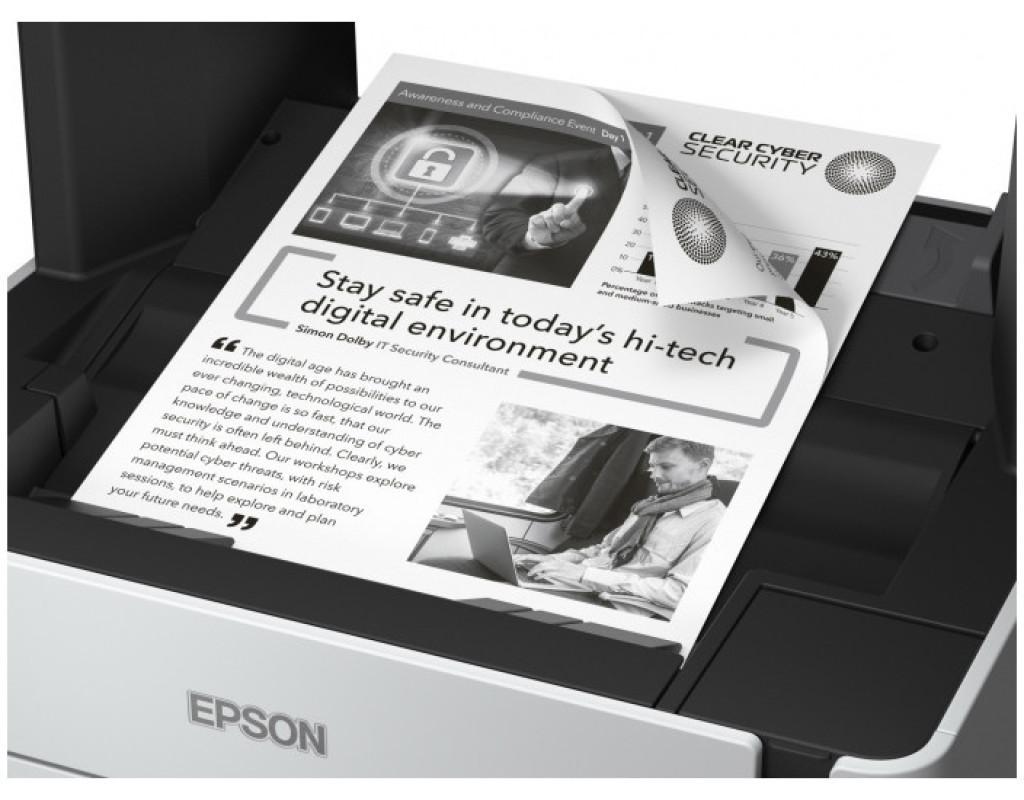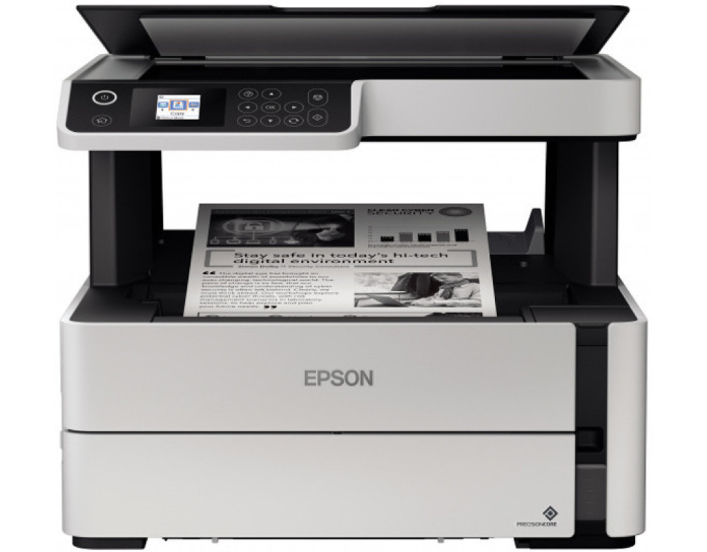 Epson М2170 — это компактное и удобное в использовании МФУ с большими емкостями для чернил вместо картриджей. Благодаря своей уникальной конструкции Фабрика печати Epson M2170 позволяет печатать документы с рекордно низкой себестоимость, а за счет использования пигментных чернил отпечатки мгновенно высыхают и не размазываться при попадании воды или механическом воздействии. Кроме того данное устройство обладает широкими возможностями беспроводного подключения, а также функцией автоматической двусторонней печати. Рекордно низкая себестоимость печати Благодаря большим емкостям и контейнерам с чернилами по 120 мл вы сможете напечатать большой объем документов по рекордно низкой цене: всего 20 копеек за документ формата А41 Два контейнера с чернилами емкостью по 120 мл поставляется в комплекте вместе с устройством. Благодаря этому, уже со стартового комплекта чернил можно распечатать до 11 000 документов, что, несомненно, позволит сэкономить, и существенно снизит стоимость владения устройством. Высокий ресурс расходных материалов Расходными материалами к Монохромной Фабрике печати служат только контейнеры с чернилами, с высоким ресурсом. Так одного контейнера с черными чернилами хватит на печать 6 000 ч/б документов А43 Беспроводное подключение по Wi-Fi Преимущества беспроводного подключения в том, что, находясь в любом уголке квартиры или офиса, пользователь может оперативно распечатать необходимые документы или фотографии с любого устройства с поддержкой Wi-Fi или отсканировать на него необходимые материалы. Кроме того, вы можете сэкономить пространство на рабочем столе, установив принтер в удобном месте. Подключение по сети Ethernet Данное устройство дает возможность сетевого подключения, что делает его идеальным решением для работы с нескольких ПК в условиях офиса. Причём ваши сотрудники смогут не только отправлять задания на печать, но и сканировать изображения каждый со своего компьютера, что сэкономит их рабочее время и ускорит производственный процесс. Экономьте бумагу с функцией автоматической двусторонней печати Благодаря функции автоматической двусторонней печати, вы можете печатать с двух сторон листа. Так вы снизите расходы на бумагу. Удобство работы и безопасная транспортировка устройства За счет встроенной в корпус чернильной ёмкости Epson M2170 компактны и легко вписываются даже в ограниченное рабочее пространство. А фронтальное расположение этой ёмкости позволяет легко определить уровень чернил и удобно перезаправлять устройство. Кроме того, при заправке невозможно испачкаться – благодаря специальному клапану на контейнере чернила не проливаются мимо (система «Ink lock»). Новая гарантия на Монохромную Фабрику печати Epson Подтверждением высокой надежности Фабрики печати Epson M2170 является предоставление гарантии на 12 месяцев или 100 000 отпечатков2. Отличное качество печати документов При печати устройство использует уникальные пигментные чернила Epson, которые обеспечивают: