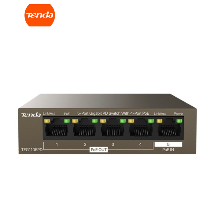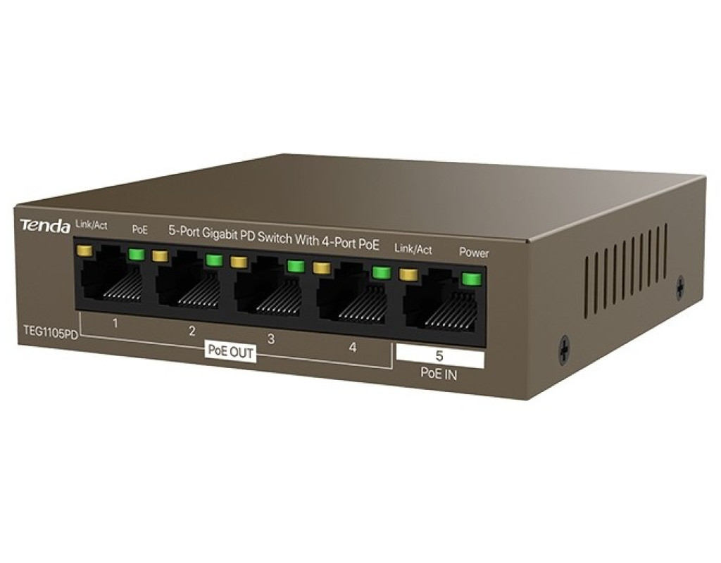 | Tenda TEG1105PD - гигабитный 5 портовый PoE коммутатор с питанием от PoE, сочетает в себе высокую производительность, функцию Plug & Play, является одновременно как PSE, так и PD, и, кроме того, имеет привлекательную стоимость для применения в таких сценариях, как организация видеонаблюдения в общественных местах (парки, дороги, школы, детские площадки, предприятия), а так же публичных Wi-Fi сетей с точками доступа с низким энергопотреблением. Благодаря небольшим размерам (сравнимые с двумя банковскими картами), он легко монтируется в водонепроницаемые боксы для эксплуатации на улице. Tenda TEG1105PD оснащен четырьмя исходящими PoE портами 10/100/1000 Мбит\сек (порты с 1 по 4), совместимыми с IEEE 802.3 af, и входящим PoE портом 10/100/1000 Мбит\сек, совместимым с IEEE 802.3 af/at (порт № 5). Суммарная максимальная выходная мощность Tenda TEG1105PD по PoE- до 30 Вт. Коммутатор может подавать питание и передавать данные на маломощные точки доступа и IP-камеры по кабелю CAT5, что значительно снижает стоимость развертывания сети. Tenda TEG1105PD - идеальный выбор для применения в проводных сетях видеонаблюдения на средних и дальних расстояниях. |