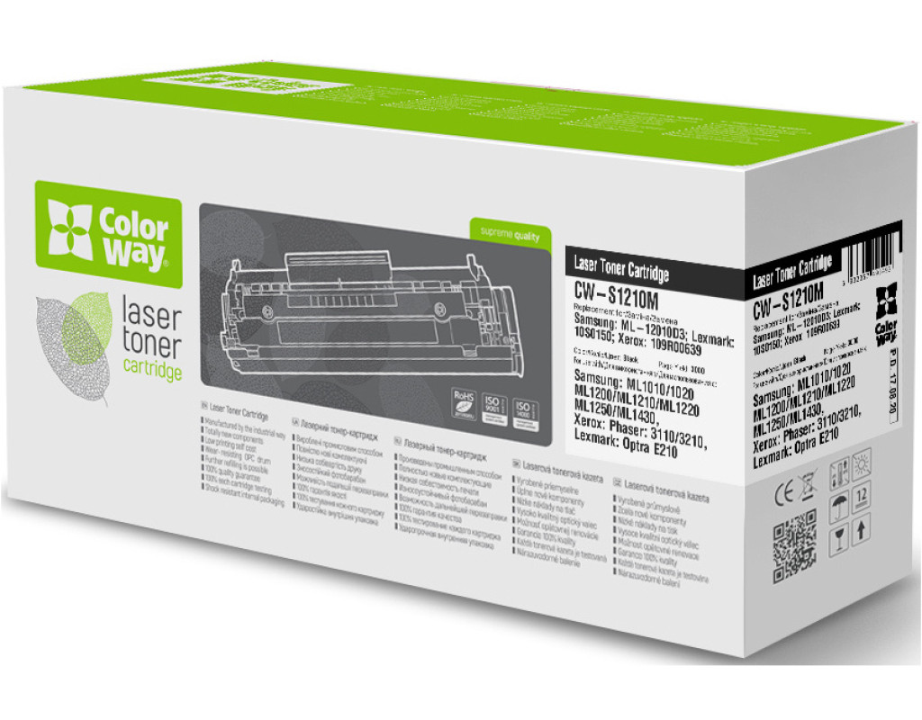 | Картридж ColorWay для Samsung ML-1210D3/XEROX 3110 (CW-S1210N) Ресурс катриджа - 3000 листов, при 5% заполнении. Качество печати и ресурс тестируются по международному стандарту STMC. Расход зависит от того, насколько страница заполнена. На стандартной странице текста площадь под чернилами составляет 5%. Это стандартная характеристика заполнения тонером поверхности бумаги, и нормы расхода тонера (ресурс картриджа) приводятся именно по ней. Совместимые модели с ColorWay (CW-S1210N): Samsung ML-1210D3 XEROX 3110 |