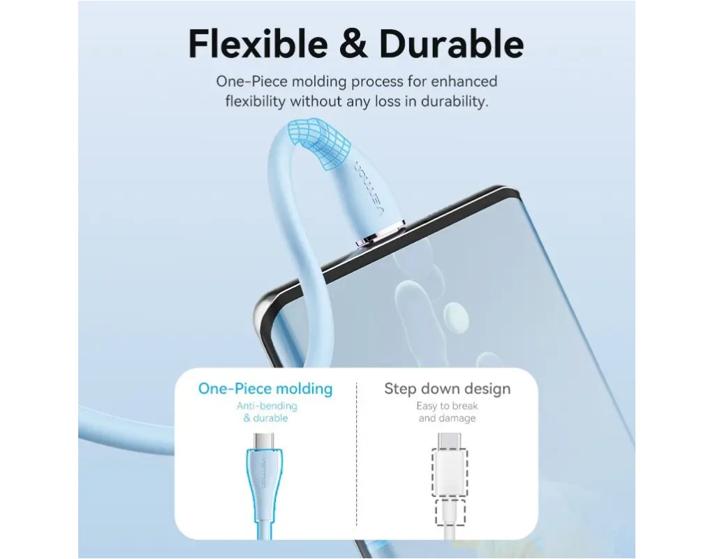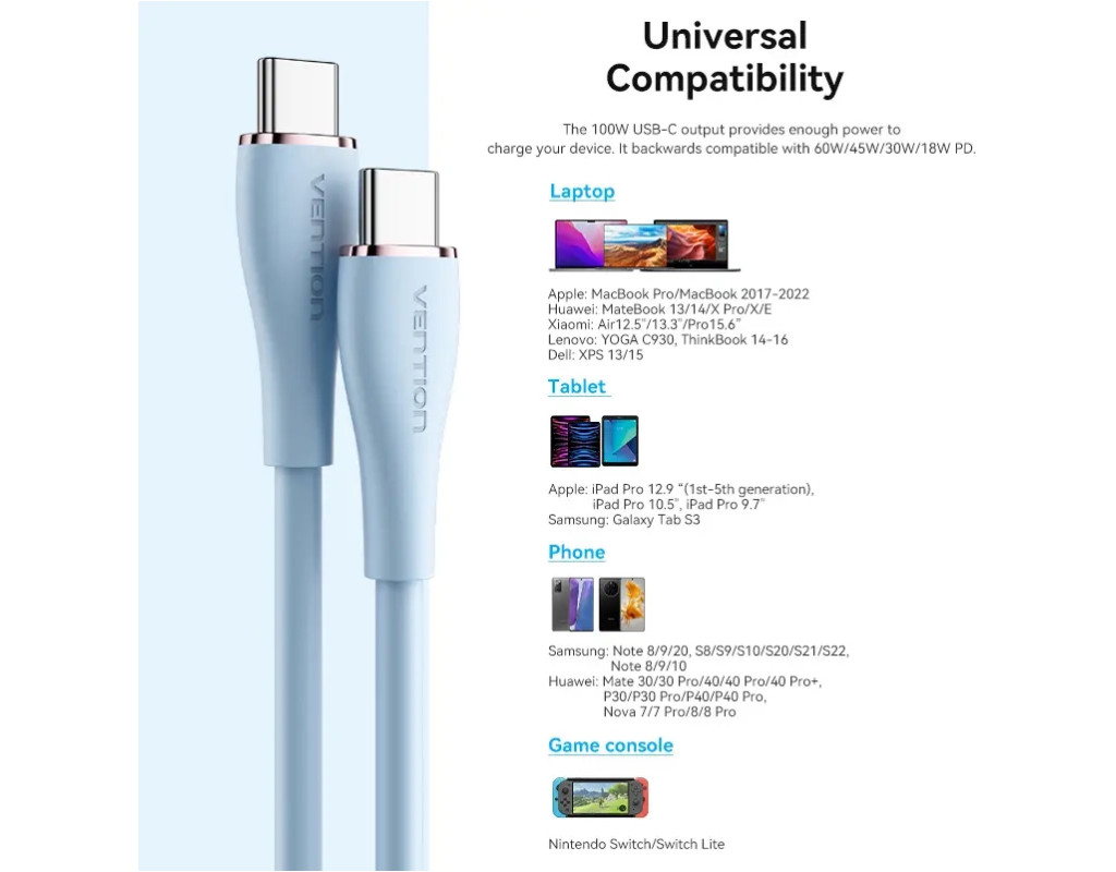 Дата кабель USB-C to USB-C 1.0m USB2.0 100W (20V/5A) Light Blue Silicone VENTION (TAWSF)