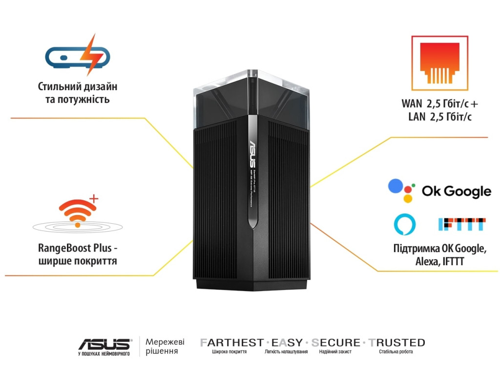 | Маршрутизатор ASUS ZenWiFi Pro ET12 2PK (90IG05Z0-MO3A20) создан для современных пользователей, стремящихся максимизировать производительность своей сети и наслаждаться преимуществами новейших технологий бесперебойной связи. Благодаря мощному четырёхъядерному процессору 2.0 GHz и 1 ГБ оперативной памяти, этот маршрутизатор обеспечивает несравненную скорость и надёжность, делая его идеальным решением для больших семей и профессиональных офисных сетей. ASUS ZenWiFi Pro ET12 поддерживает стандарт Wi-Fi 6E, обеспечивая новейший уровень беспроводной связи с максимальной скоростью передачи данных до 11000 Мбит/с. Это позволяет комфортно использовать сеть сразу большому количеству устройств, поддерживая интенсивные потоковые трансляции, онлайн-игры и удалённую работу без задержек и обрывов. Одно из ключевых преимуществ системы – это возможность Mesh-покрытия, позволяющего создать широкомасштабную сеть без "мёртвых зон", объединяя несколько узлов в одну экосистему. Технология ASUS AiMesh позволяет интегрировать другие совместимые маршрутизаторы для расширения диапазона или функционала сети. Это значит, что вы можете адаптировать ZenWiFi Pro ET12 под конкретные нужды вашего дома или офиса. Модель оснащена встроенными антеннами – десятью на каждое устройство комплекта, обеспечивающими надёжное покрытие беспроводного сигнала в любом направлении. Кроме того, порты LAN и WAN 2.5G Ethernet позволяют в полной мере наслаждаться высокими скоростями кабельного подключения. С новым диапазоном 6 ГГц вы сможете создать стабильный backhaul-канал для соединения узлов между собой, минимизируя нагрузку на другие частоты. Безопасность – ещё одно неотъемлемое преимущество ZenWiFi Pro ET12. Система AiProtection Pro защищает вашу сеть от онлайн-угроз благодаря новейшим стандартам безопасности, включая WPA3. Кроме того, поддержка VPN и шифрование данных с помощью Instant Guard позволяет чувствовать себя в безопасности, даже работая в сетях общего доступа. Особенность ZenWiFi Pro – это поддержка голосовых ассистентов Google и Alexa, что делает управление сетью ещё удобнее и интуитивнее. Этот умный маршрутизатор создан для тех, кто хочет получить максимум от своей цифровой инфраструктуры, подчеркивая стильный дизайн, стабильность и скорость работы. ASUS ZenWiFi Pro ET12 – это идеальный выбор для требовательных пользователей, которые ценят качество, инновации и надёжность, создавая оптимальную среду для работы и развлечений в цифровом мире. |