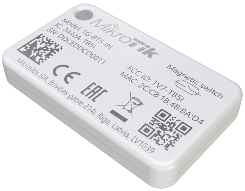 | MikroTik Indoor Bluetooth tag (TG-BT5-IN) - внутренний Bluetooth трекер для MikroTik KNOT или других настроек отслеживания IoT активов / телеметрии. Тонкий и гладкий, идеально подходит для отслеживания запасов в помещении. Встроенные датчики температуры и акселерометр, встроенный аккумулятор, которого хватит на долгие годы. Поддержка формата телеметрии iBeacon, Eddystone, MikroTik. |