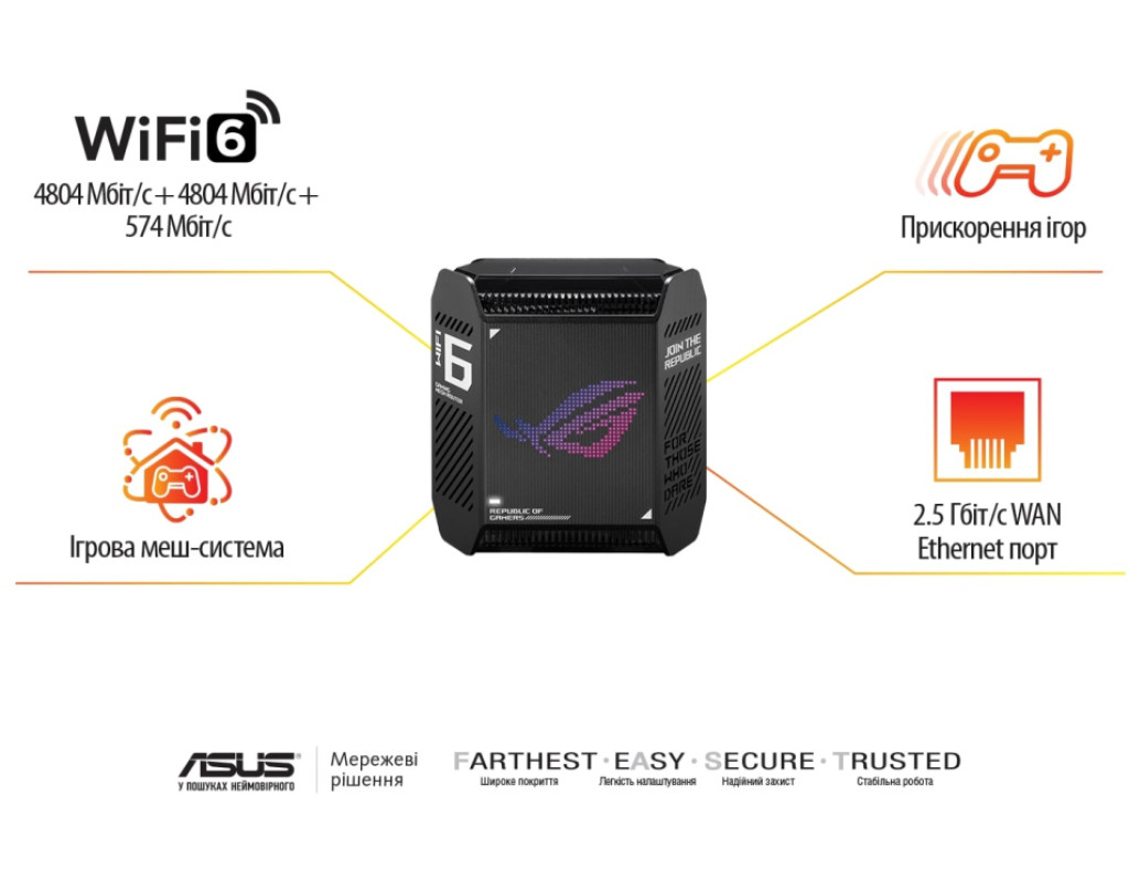 | ROG Rapture GT6 – первая трехдиапазонная ячеистая система Wi-Fi, и в ней реализованы самые передовые сетевые технологии. Эта новинка в серии маршрутизаторов Rapture станет порталом в мир интернета и позволит испытать все преимущества полноценного сетевого решения Wi-Fi следующего поколения. |
