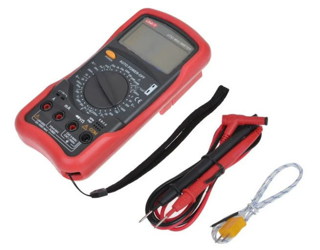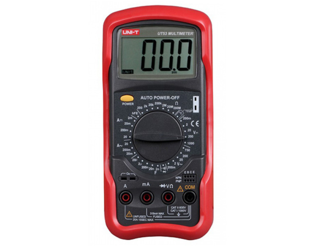 Цифровой мультиметр UNI-T UT53 – высококачественный многофункциональный цифровой мультиметр. Это удобное портативное устройство питается от 9-вольтной батареи. В мультиметре UNI-T UT53 предусмотрены функции автоматического отключения, измерения различных параметров (напряжение, ток, сопротивление, емкость, температура) и тесты (тестирование диодов, проверка транзисторов, прозвонка цепи). Особенности