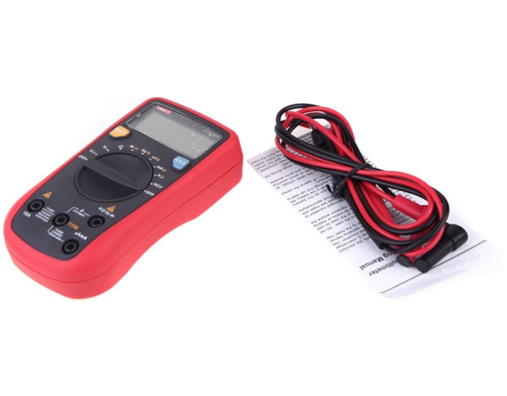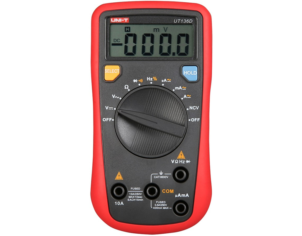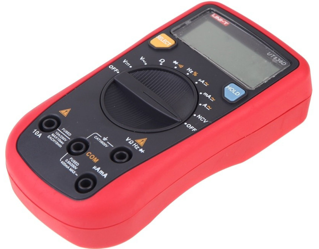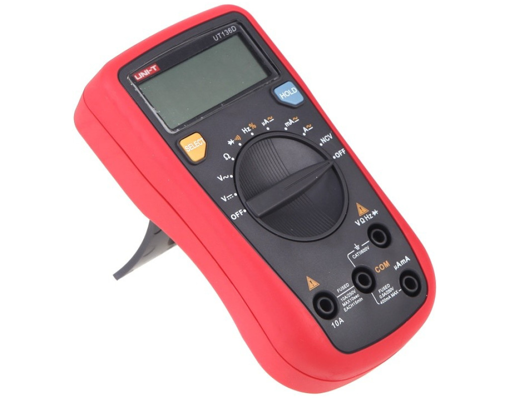 Мультиметр UT136D – универсальный измерительный прибор от бренда UNI-T. Кроме основных параметров способен измерять скважность и частоту. В данной модели реализована функция удержания показаний. Автоматический выбор режимов измерений. Бесконтактный поиск скрытой проводки. Автоотключение. Простой и надежный инструмент. Отличное сочетание цены и качества. Особенность мультиметра UNI-T UT136DВнешний вид Прибор выполнен из прочного и качественного пластика. Внешне об облачен в защитный чехол из прорезиненного материала. Он предназначен предотвращать повреждения от падения с небольшой высоты и других механических воздействий. Основные элементы имеют классическое расположение. В верхней части прибор расположился жидкокристаллический экран на 3999 отсчетов. Под ним находятся кнопки включения и вызова функции удержания показаний. Центральную часть устройства занимает переключатель режимов измерений. Разъемы для подключения щупов находятся в нижней части. Сзади есть откидная ножка, позволяющая установить мультиметр в горизонтальное положение для более удобной работы. Проводимые измеренияМультиметр UNI-T UT136D способен проводить измерения следующих параметров: В отличие от других измерительных устройств, рассматриваемая модель способна проводить измерения скважности сигнала, частоты до 10 МГц и емкости до 100 мкФ. Кроме того, данная модель способна проверять цепь на целостность при помощи звуковой прозвонки, тестировать диоды и транзисторы. Дополнительные функцииБесконтактный поиск скрытой проводки. Рассматриваемая модель имеет возможность поиска скрытой проводки бесконтактным способом. Для этого необходимо всего лишь поднести прибор к предполагаемому месту нахождения провода под напряжением. В случае обнаружения прибор оповестит об этом. Функция удержания показаний. UNI-T UT136D оснащен функцией фиксации полученных результатов измерений. В случае необходимости записать их или показать кому-нибудь, стоит нажать кнопку HOLD и результаты зафиксируются до момента повторного нажатия на эту кнопку. Автоматическое отключение. При длительном бездействии устройство самостоятельно выключает питание. Данная функция в значительной степени сохранит заряд батареи. |