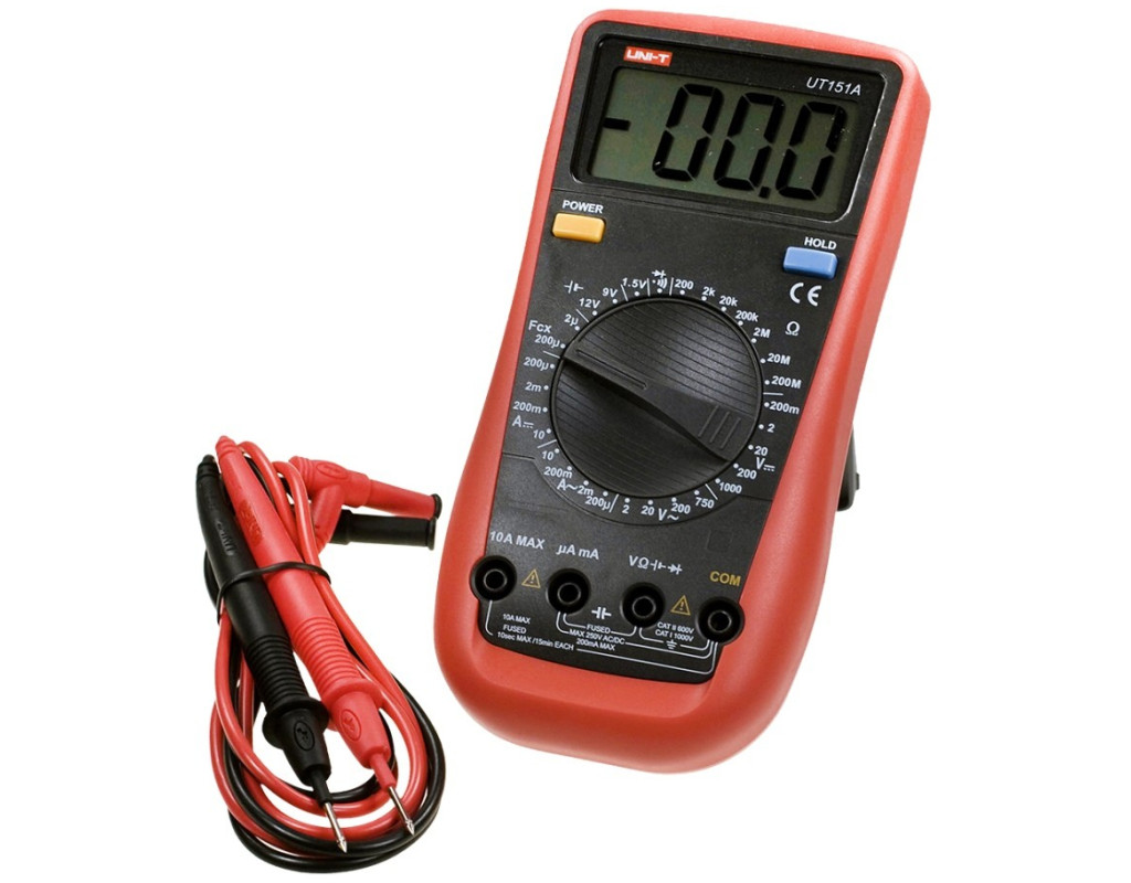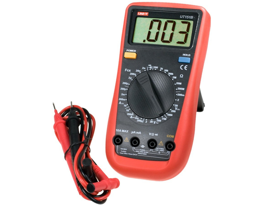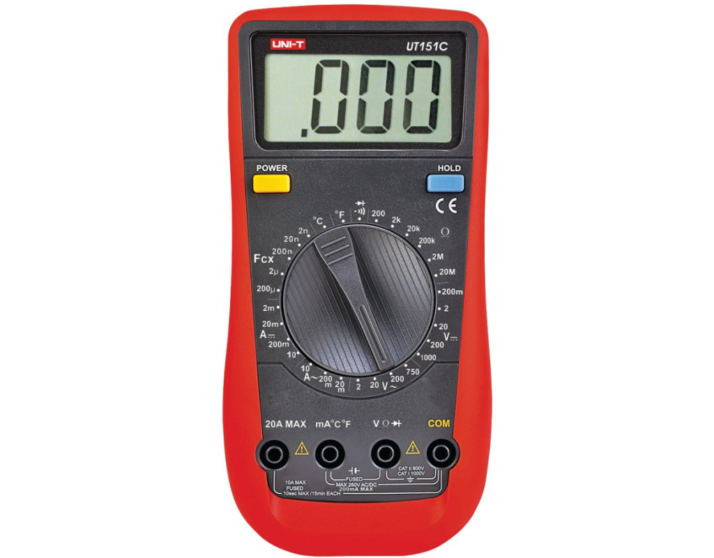 UNI-T UT151C – это цифровой мультиметр с ручным выбором диапазона, предназначенный для измерения AC/DC напряжения и AC/DC тока, сопротивления, емкости, температуры, а также тестирования диодов и прозвонки цепи. Особенности
