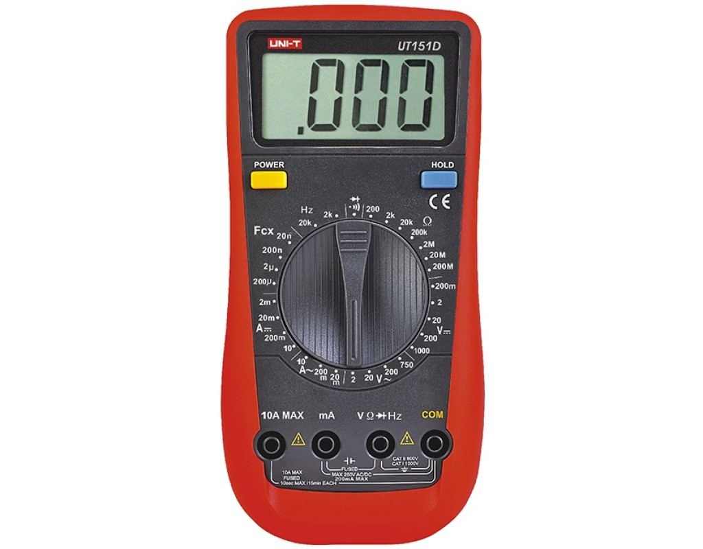 Мультиметр UT151D – универсальный измерительный прибор от бренда UNI-T. Кроме основных параметров способен измерять емкость и частоту. В данной модели реализованы функции удержания показаний. Ручной выбор режимов измерений. Автоматическое отключение. Простой, недорогой и надежный инструмент. Отличное сочетание цены и качества. Особенность мультиметра UNI-T UT151DВнешний вид Прибор выполнен из прочного и качественного пластика. Внешне об облачен в защитный чехол из прорезиненного материала. Он предназначен предотвращать повреждения от падения с небольшой высоты и других механических воздействий. Основные элементы имеют классическое расположение. В верхней части прибор расположился жидкокристаллический экран на 1999 отсчетов. Под ним находятся кнопки включения и вызова функции удержания показаний. Центральную часть устройства занимает переключатель режимов измерений. Разъемы для подключения щупов находятся в нижней части. Сзади есть откидная ножка, позволяющая установить мультиметр в горизонтальное положение для более удобной работы. Проводимые измеренияМультиметр UNI-T UT151D способен проводить измерения следующих параметров: В отличие от других измерительных устройств, рассматриваемая модель способна измерять емкость до 100 мкФ и частоту до 20 кГц. Кроме того, данная модель способна проверять цепь на целостность при помощи звуковой прозвонки, тестировать диоды и транзисторы. Дополнительный функцииФункция удержания показаний. UNI-T UT151D оснащен функцией фиксации полученных результатов измерений. В случае необходимости записать их или показать кому-нибудь, стоит нажать кнопку HOLD и результаты зафиксируются до момента повторного нажатия на эту кнопку. |
