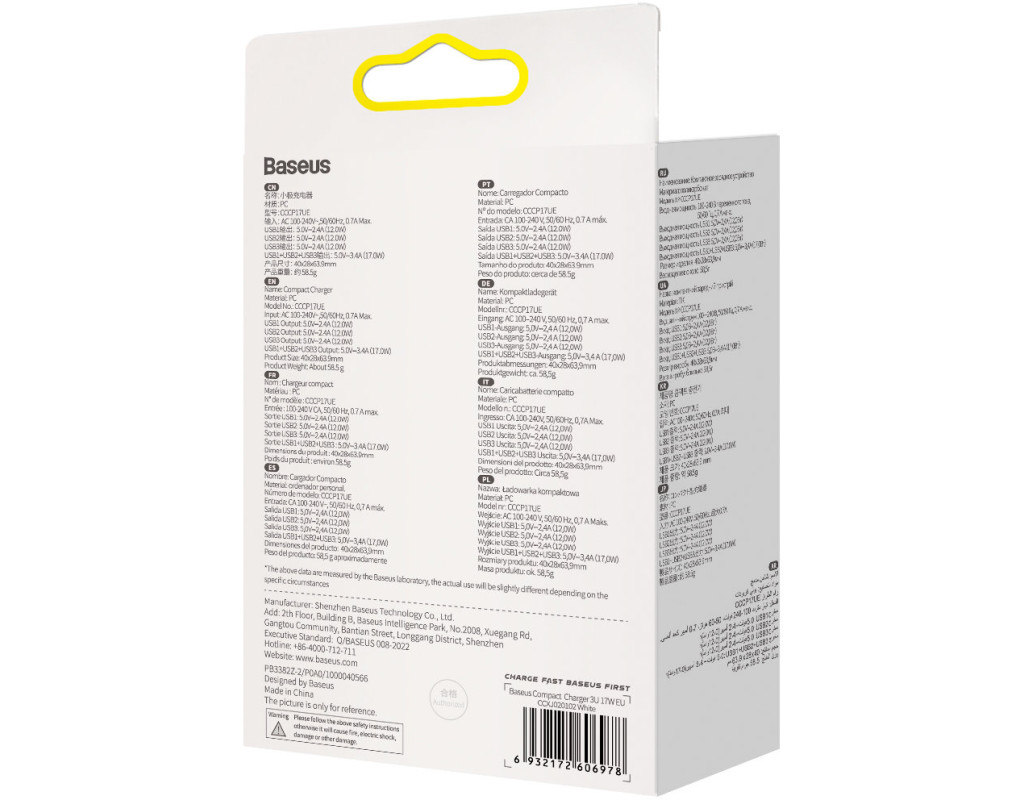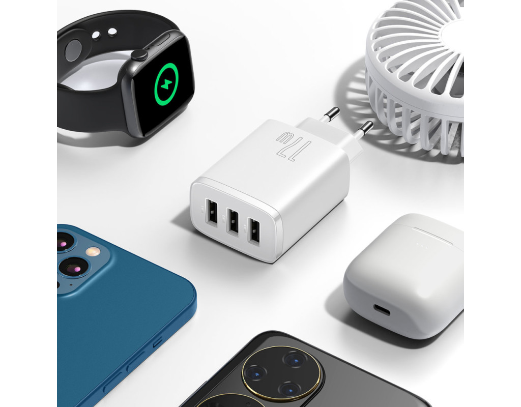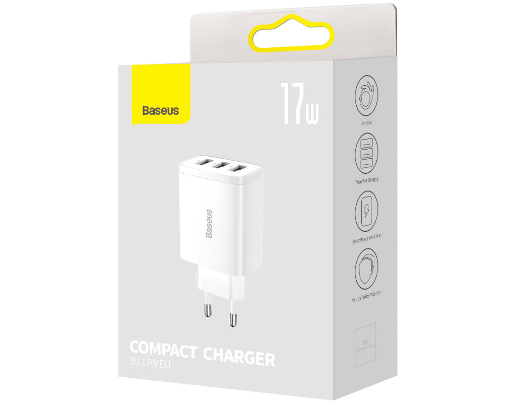 | Cетевое зарядное устройство Baseus Compact Charger 3U 17 Вт EU Белое (CCXJ020102) – это компактное, элегантное, инновационное и стильное устройство с тремя USB портами, которые помогут вам одновременно заряжать 3 устройства благодаря выходной мощности 3.4 A. Вам больше не придется выбирать, что зарядить первым - телефон, аудио колонку, часы, беспроводные наушники или поставить на зарядку планшет ребенка. Вы сможете подключить все эти гаджеты к одной зарядке. Зарядное устройство имеет 3 USB мощностью 3.4 A/2.4 A, которые помогут вам быстро заряжать самые различные девайсы. Детали корпуса зарядного устройства Baseus Compact Charger 3U 17 Вт EU надежно собраны из пластика высокого качества, что обеспечит комфортную работу для владельца устройства. Зарядка Baseus Compact Charger 3U 17 Вт EU обладает продуманной конструкцией, которая позволяет одновременно подключать три устройства для зарядки без каких-либо трудностей. Характеристики: