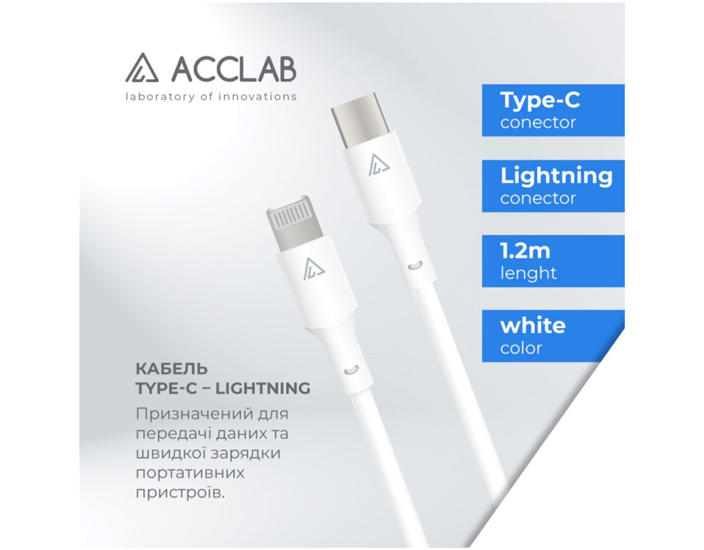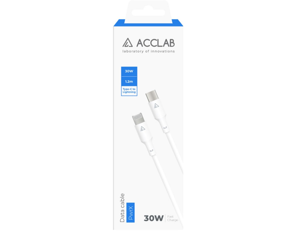 | Кабель синхронизации ACCLAB PwrX 30W Type-C to Lightning 1,2м (белый) – качественный и незаменимый аксессуар для передачи данных и быстрой зарядки мобильных устройств, оборудованных Type-C to Lightning разъемом. Кабель обладает надежной изоляцией, ведь все внутренние элементы кабеля изолированы износостойким синтетическим материалом, который повышает его долговечность, а качественная медь увеличивает его долговечность и обеспечивает стабильную работу в течение всего срока эксплуатации кабеля. Особенности: • Надежная изоляция • Быстрая зарядка • Качественная медь • Пропускная способность тока 2.4 А • Литый коннектор специальной формы • Эластичный TPE-материал |