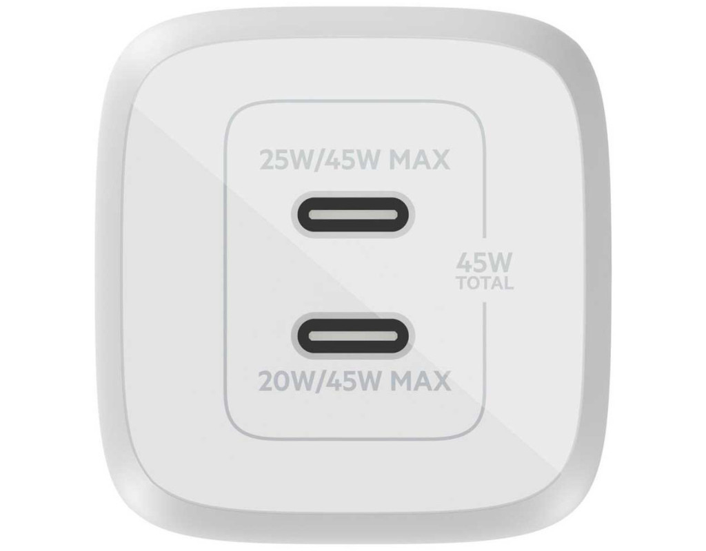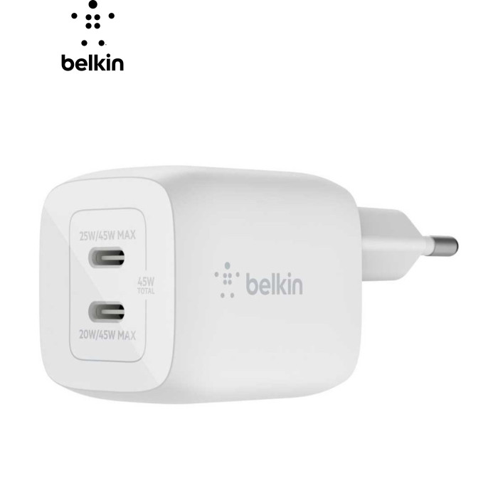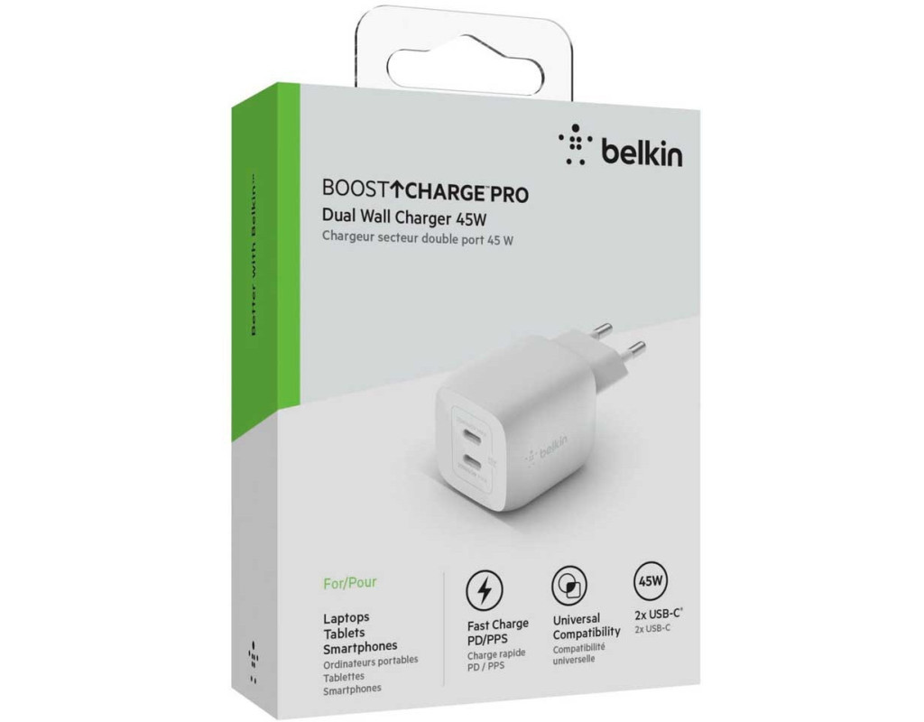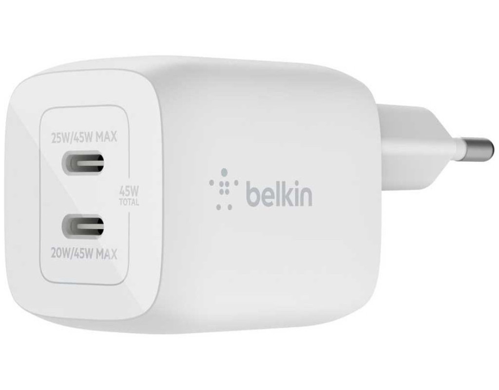 | Сетевое ЗУ Belkin Home Charger 45W GaN PD PPS Dual USB-С. Компактная мощность GaN. Повышайте производительность и развлечения с помощью компактного и мощного зарядного устройства Power Delivery (45W) c двумя портами USB-С. |