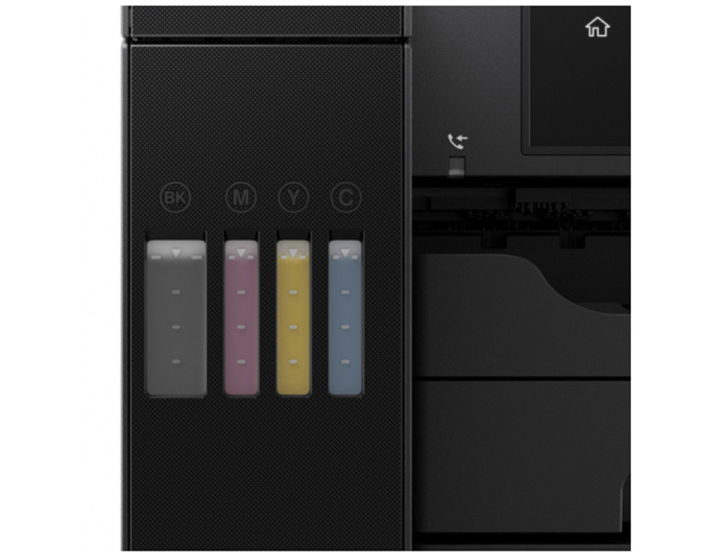 | Фронтальные чернильные емкости Особенность всех устройств серии «Фабрика печати Epson» – это печать без картриджей. Вместо картриджей Epson L6570 использует фронтальные чернильные емкости. Фронтальное расположение емкостей делает устройство более компактным и обеспечивает удобное отслеживание уровня чернил. Высокий ресурс расходных материаловОбъем чернильных контейнеров к МФУ Epson L6570 в 10 раз превышает объем стандартных картриджей и составляет 70 мл цветных и 127 мл черных чернил. Полного комплекта чернильных контейнеров хватит на печать до 7500 ч/б и 6000 цветных страниц. Высокая скорость печатиБлагодаря уникальной печатающей головке Epson PrecisionСore TFP4 Epson L6570 печатает со скоростью до 25 страниц в минуту в черно-белом режиме и 25 страниц в минуту в цвете по стандарту ISO2, значительно сокращая время на печать, что особенно оценят пользователи с большими объемами печати. Инновационная система заправки чернил «Key Lock»Система «Key Lock» не даст перепутать цвета при заправке. Секрет новой системы заправки в уникальной форме носика контейнера, которая совместима только с соответствующим по цвету заправочным отверстием по принципу ключа с замком. Новые контейнеры со встроенным клапаном перекрытия чернилКонтейнеры с чернилами оснащены внутренним клапаном, который защищает от случайного проливания при переворачивании контейнера. Клапан открывается только при установке контейнера в отверстие для заправки, после чего чернила начинают поступать внутрь печатающей системы. Как только вы вынимаете контейнер из заправочного отверстия - клапан блокирует подачу чернил, исключая возможность случайного проливания. Пигментные чернила всех цветовПри печати устройство использует уникальные пигментные чернила Epson, которые обеспечивают: