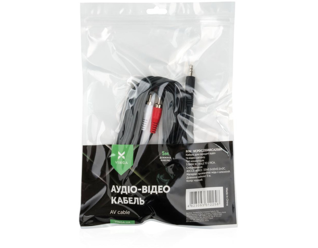 Кабель мультимедийный 3.5mm M to 2xRCA M 5.0m Vinga (VCPDCJ35MRCA25BK)