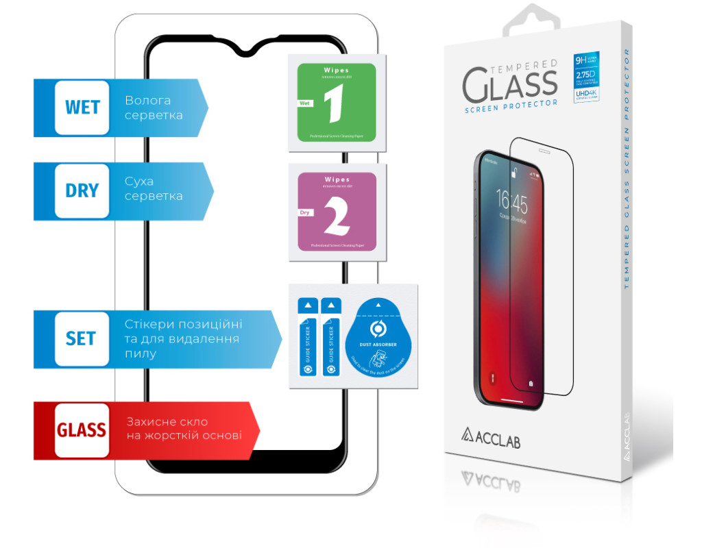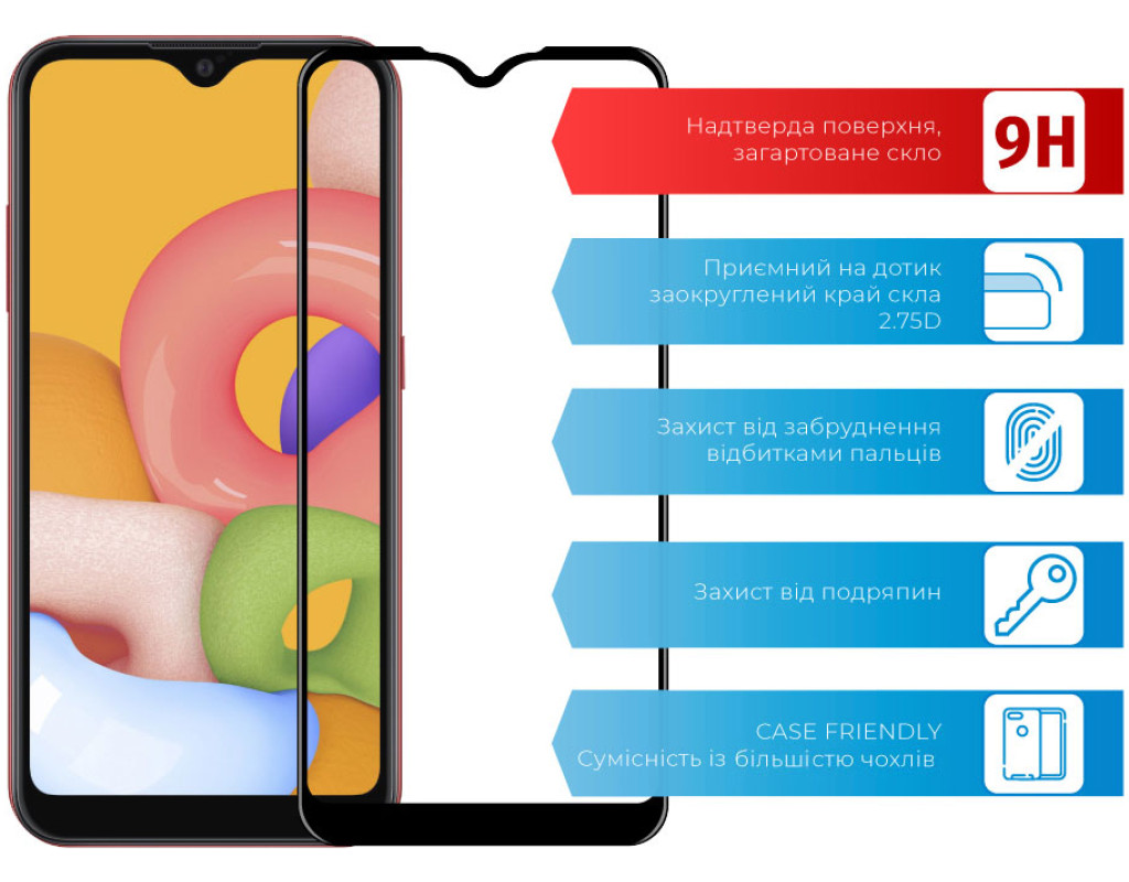 Назначение - для телефона, Вид покрытия - защитное, Совместимость с моделями - Samsung Galaxy A01, Особенности - прочность: 9Н, влажная салфетка, Количество в упаковке - 1 шт
